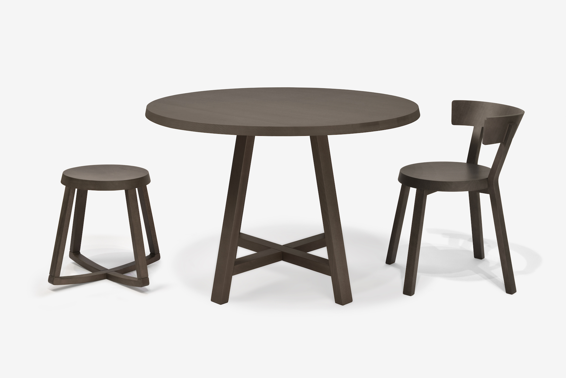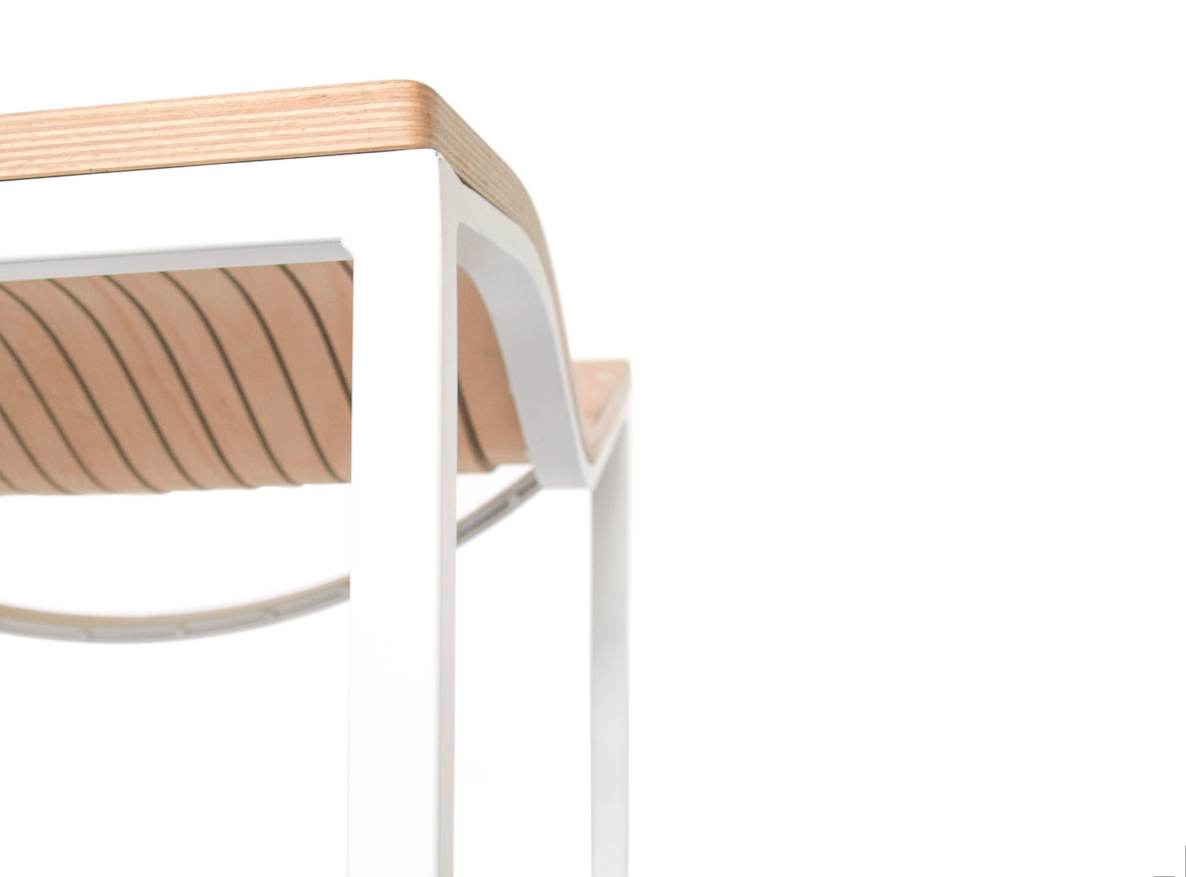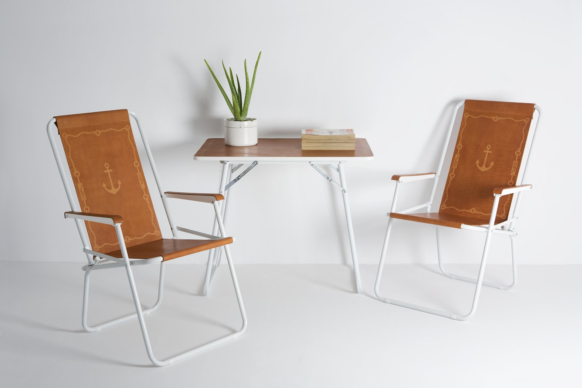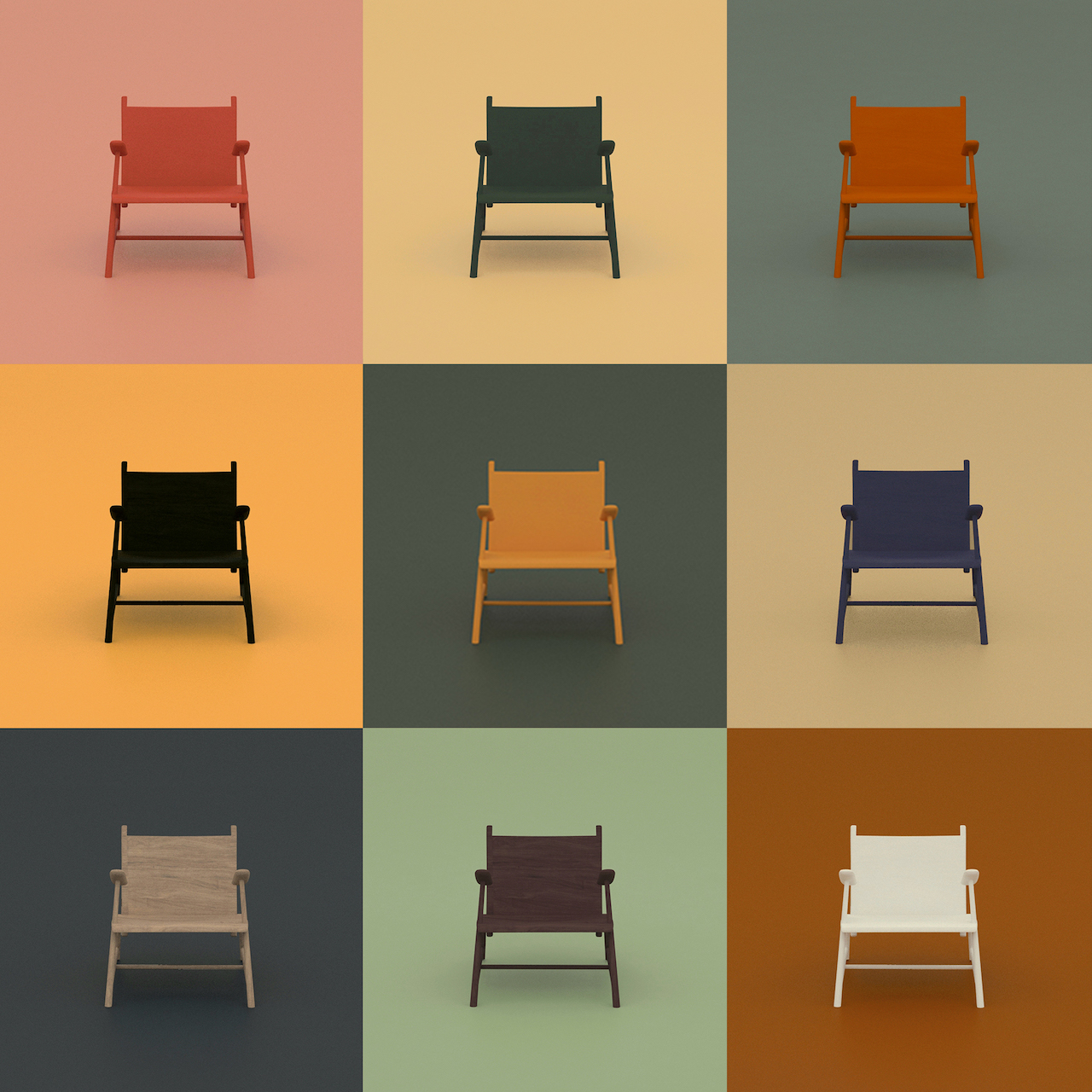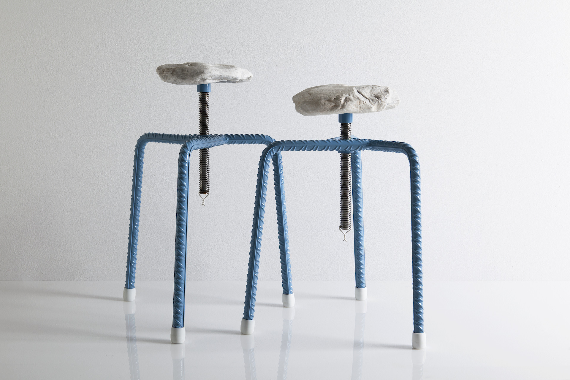 Έχουμε επέμβει σε δυο ήδη υπάρχοντα σχέδια καρέκλας και έχουμε επίσης σχεδιάσει τρία σκαμπό εκ νέου. Όσον αφορά τις προσαρμογές, θέλαμε να επέμβουμε σε κάποια σχέδια που θεωρούμε εμβληματικά του ελληνικού αστικού τοπίου, όπως η πανταχού παρούσα λευκή πλαστική μονομπλόκ καρέκλα και η αναδιπλούμενη καρέκλα κάμπινγκ που μεσουρανούσε παλαιότερα. Όσον αφορά τα σκαμπό, η αφετηρία σκέψης ήταν και πάλι κάποια σχόλια και το κλείσιμο του ματιού σε ελληνικές λεπτομέρειες.