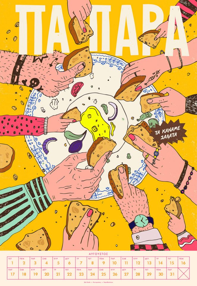 Σε ποιους απευθύνονται με αυτή τη δουλειά; Σε όλους. «Είναι μεν ένα design ημερολόγιο με ιδιαίτερες εικονογραφήσεις αλλά το περιεχόμενο του είναι καθημερινό, χιουμοριστικό, ελληνικό και καθόλου εξεζητημένο. Μπορεί να το δεις από την κουζίνα της μαμάς σου και το παιδικό δωμάτιο της ανιψιάς σου, μέχρι σε καφετέριες, μουσεία και art galleries και να στέκεται με τον ίδιο τρόπο. Κάθε μήνας είναι μια αφίσα οπότε μπορείς να καδράρεις τα αγαπημένα σου μετά και να τα θυμάσαι για πάντα. Πέρυσι ένας δικηγόρος μας πήρε τηλέφωνο έντρομος γιατί δεν έβρισκε τη φασολάδα για να διακοσμήσει το γραφείο του».