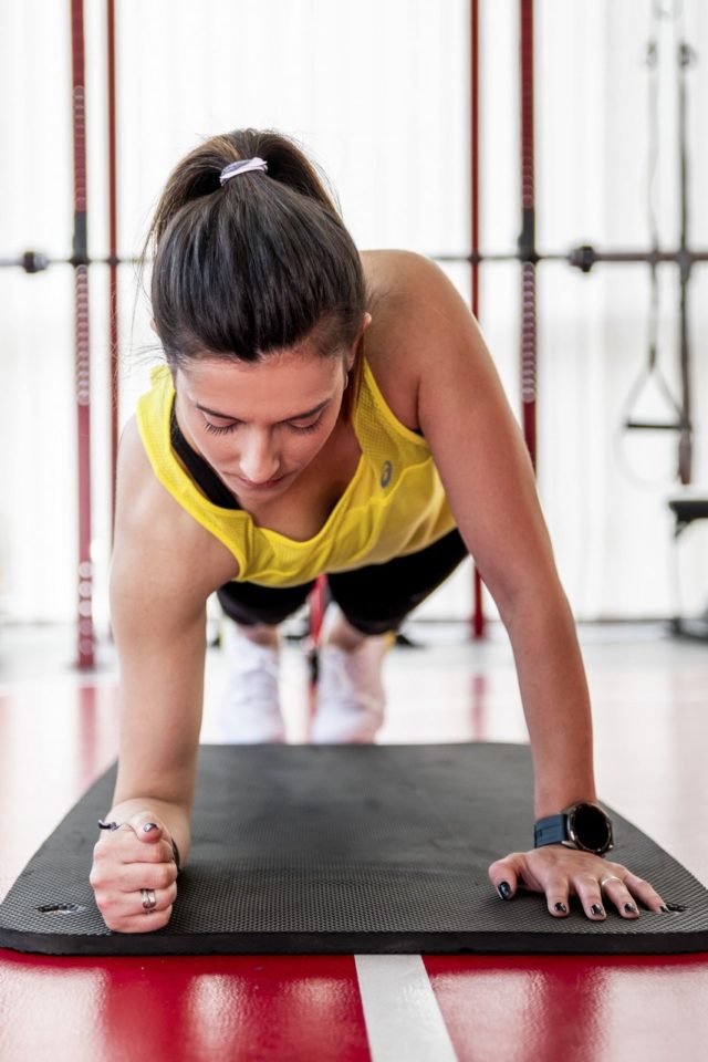 Βήμα 2: Σήκωσε τα γόνατα σου και τοποθέτησε τα πόδια σου πίσω ώστε το βάρος σου να πέφτει ακριβώς κάτω από τα δάχτυλα των ποδιών σου. Φρόντισε το σώμα σου να βρίσκεται σε ευθεία θέση. Κρατήσου σε αυτή τη θέση για 30’’- 1’.