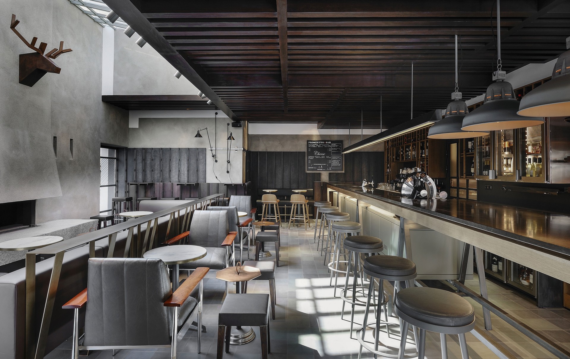 Ο ανοικτός στις τρεις πλευρές του, όγκος της βασικής αίθουσας του χώρου συναντά υπό ορθή γωνία και σε σχετικά ψηλότερο επίπεδο, τον περισσότερο εσωστρεφή χώρο του “prosciutto bar”. O γειτονικός των δύο, και περίκλειστος τρίτος χώρος καλύπτεται από την πλήρως αντιληπτή από τον επισκέπτη ανοιχτή κουζίνα και τις συνακόλουθες βοηθητικές λειτουργίες. Με τον εξ αρχής σχεδιασμό και την υλοποίηση του ελαφρού οπτικά γωνιακού χώρου του “extension bar”, σε προέκταση της βασικής αίθουσας, επινοήθηκε μια κλειστή στις τρεις πλευρές της αυλή, προσβάσιμη από το σύνολο του εσωτερικού χώρου και προσαρμοσμένη στα υπάρχοντα δέντρα του διατηρητέου περιβάλλοντος.