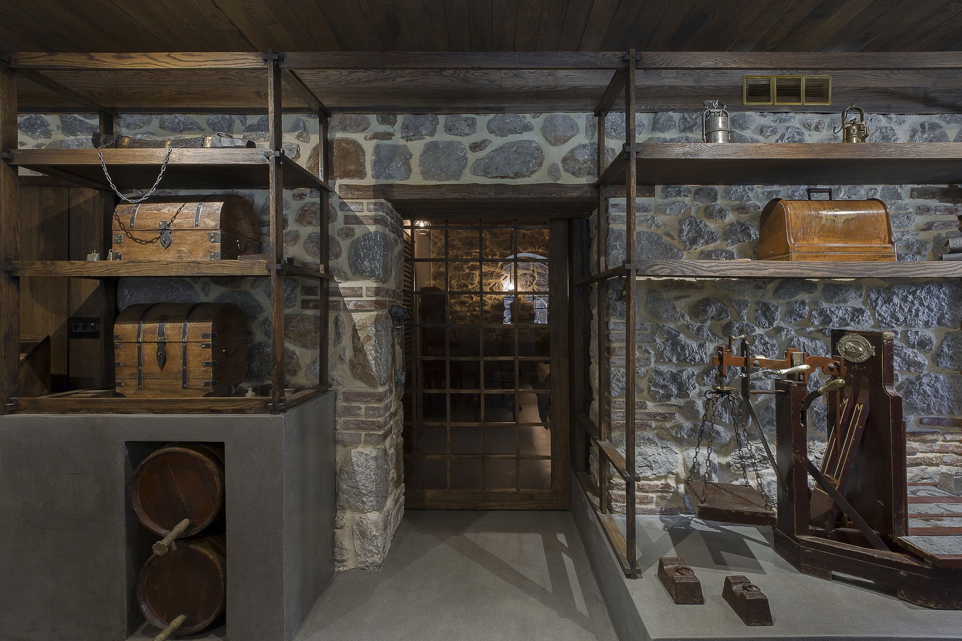Κεντρικού στοιχείο του αρχιτεκτονικού σχεδιασμού είναι μια ξύλινη αυτοφερόμενη κατασκευή, μια προθήκη τοποθετημένη πάνω σε μια σύγχρονη στέρεη βάση που φέρει τα κειμήλια του μονοπωλίου και δεκάδες μοναδικά έργα τέχνης. Η φόρμα του συμπαγούς βάθρου μεταβάλλεται στις τρεις διαστάσεις καθ’ όλο το μήκος της κατοικίας. «Τα δύο στοιχεία λειτουργούν ως ένα σύστημα ετεροχρονικών αναφορών, που σχετίζονται τόσο με την ιστορία του κτιρίου, όσο και με τον τρόπο με τον οποίο ο νέος του χρήστης καλείται να οικειοποιηθεί τον χώρο».