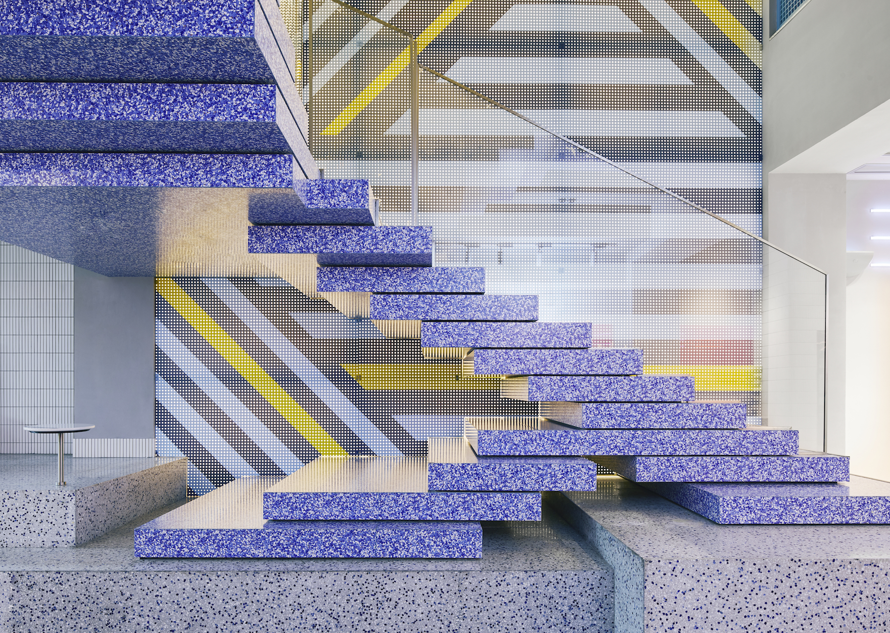 Στο κέντρο του χώρου υπάρχει μια σκάλα που μοιάζει με ετοιμόρροπο jenga αποτελούμενη από επάλληλα μονομπλόκ πάνελ και επενδυμένη με μπλε μωσαϊκό, που λειτουργεί ως «εσωτερικό αίθριο» και ενώνει οπτικά τους δύο ορόφους. «Η σκάλα αναπτύσσεται ομαλά προς τον δεύτερο όροφο με πλατύσκαλα διαφόρων μεγεθών, ενώ στη βάση της, δημιουργούνται πλατώματα όπου μπορεί κανείς να καθίσει».