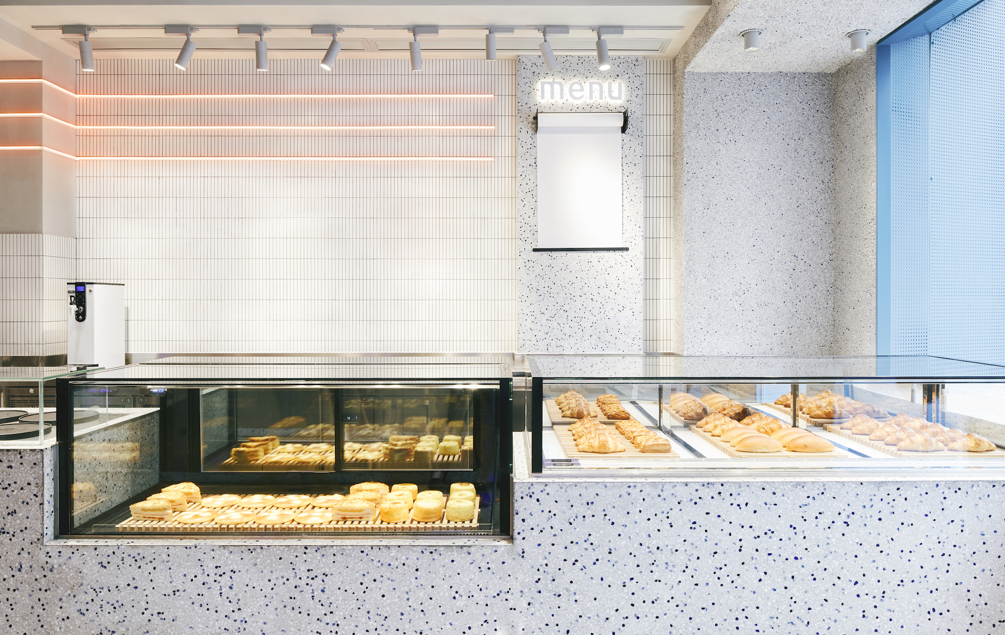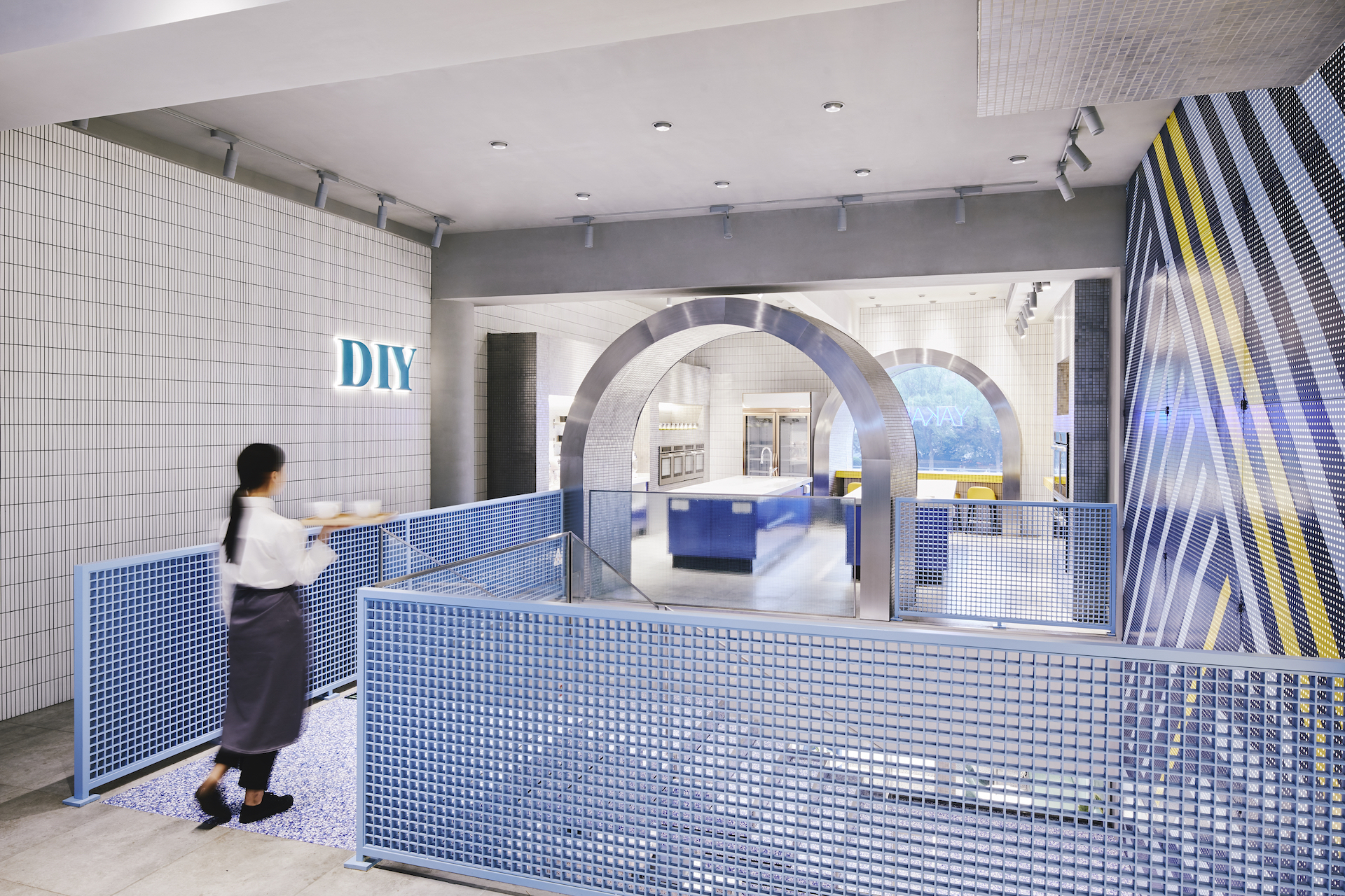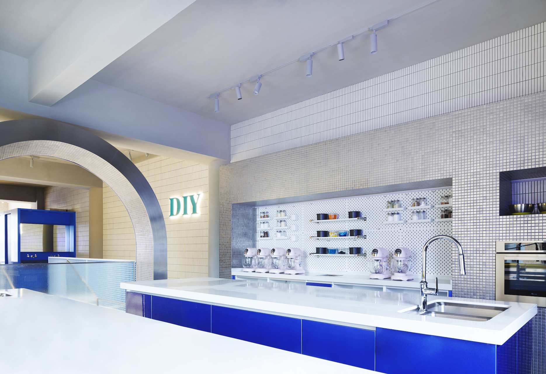 Ένας ψηλός τοίχος από διάτρητη λαμαρίνα με εσωτερικό φωτισμό και έντονα βαμμένα γραφικά οδηγεί την οπτική των επισκεπτών προς τον δεύτερο όροφο, όπου πραγματοποιούνται διάφορα εργαστήρια σχετικά με την ζαχαροπλαστική. «Στον δεύτερο όροφο, το ανοιχτό αποτύπωμα της σκάλας διαιρεί το χώρο σε δύο σημεία, στο δωμάτιο για τα DΙY σεμινάρια και σε μια αίθουσα εκδηλώσεων», όπως περιγράφει ο αρχιτέκτονας.
