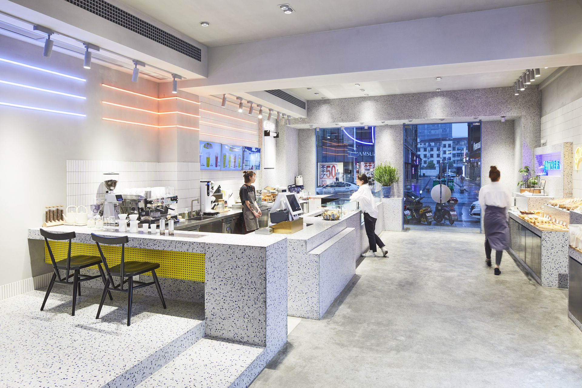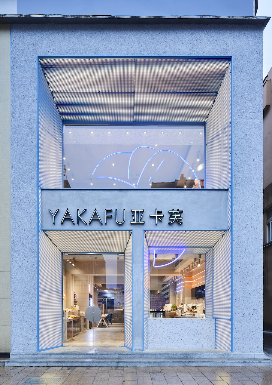 Το αρτοποιείο Yakafu DIY που σχεδίασε ο Έλληνας αρχιτέκτονας βρίσκεται στην πόλη Άντζι, στην επαρχία Τζετζιάνγκ της Κίνας. Ο σχεδιασμός του χώρου βασίζεται σε καθαρές γεωμετρίες και σε ένα παιχνίδι με έντονα χρώματα και υφές. Η πρόσοψη του καταστήματος ξεχωρίζει απ’ ότι βρίσκεται γύρω της με μια έντονη μπλε διάτρητη λαμαρίνα που φωτίζεται το βράδυ. Το εσωτερικό του καταστήματος, οι προθήκες των προϊόντων είναι διάσπαρτες στον χώρο και φτιαγμένες από διάφορα υλικά, όπως μωσαϊκό, γυαλί και ακρυλικό.