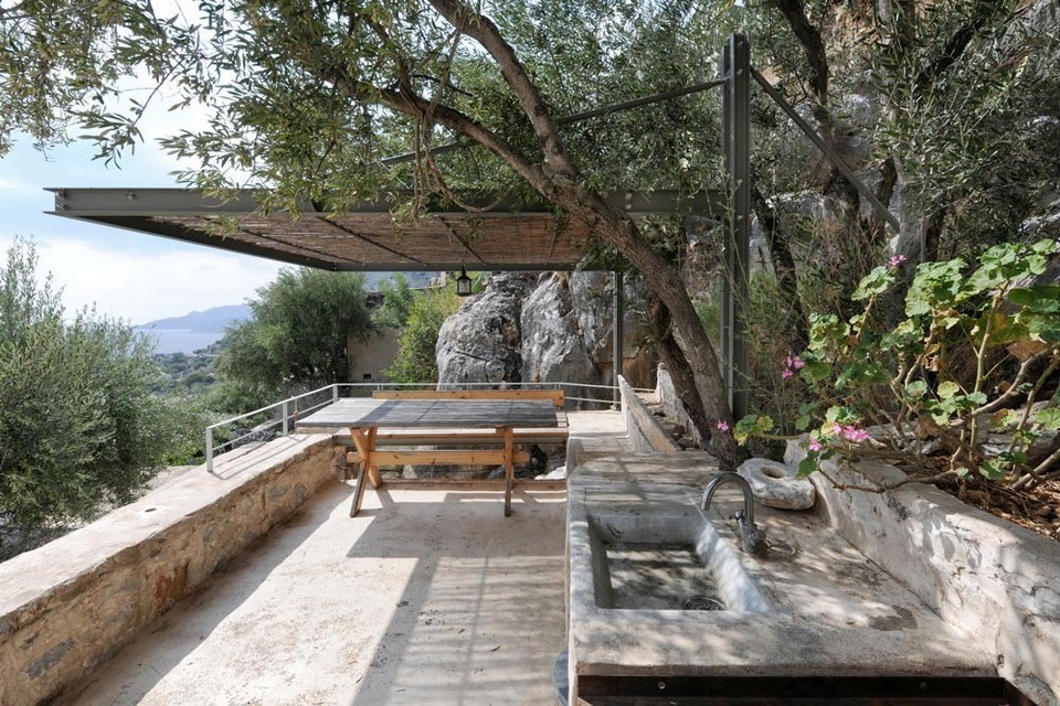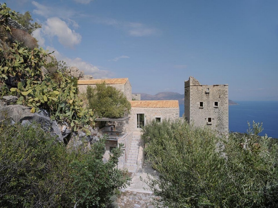 Το «Μάινα» δεσπόζει στην κορυφή ενός λόφου, θέση που του παρέχει απίστευτη θέα στους ελαιώνες και στο πέλαγος. Σχεδιάστηκε κατά τέτοιο τρόπο ώστε εμπνευσμένο από τους παραδοσιακούς πέτρινους πύργους να λειτουργεί ως μια σύγχρονη εξοχική κατοικία που αποπνέει το αρχέγονο πνεύμα της Μάνης.