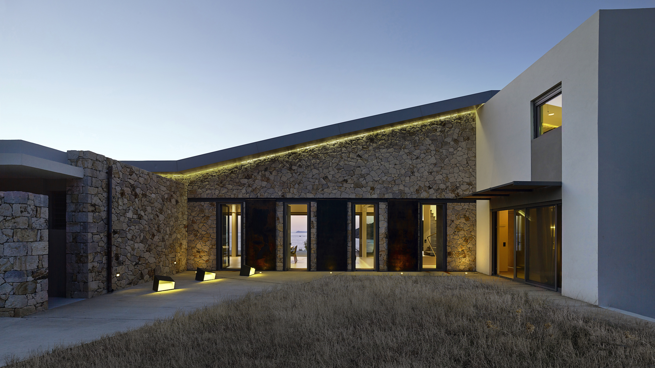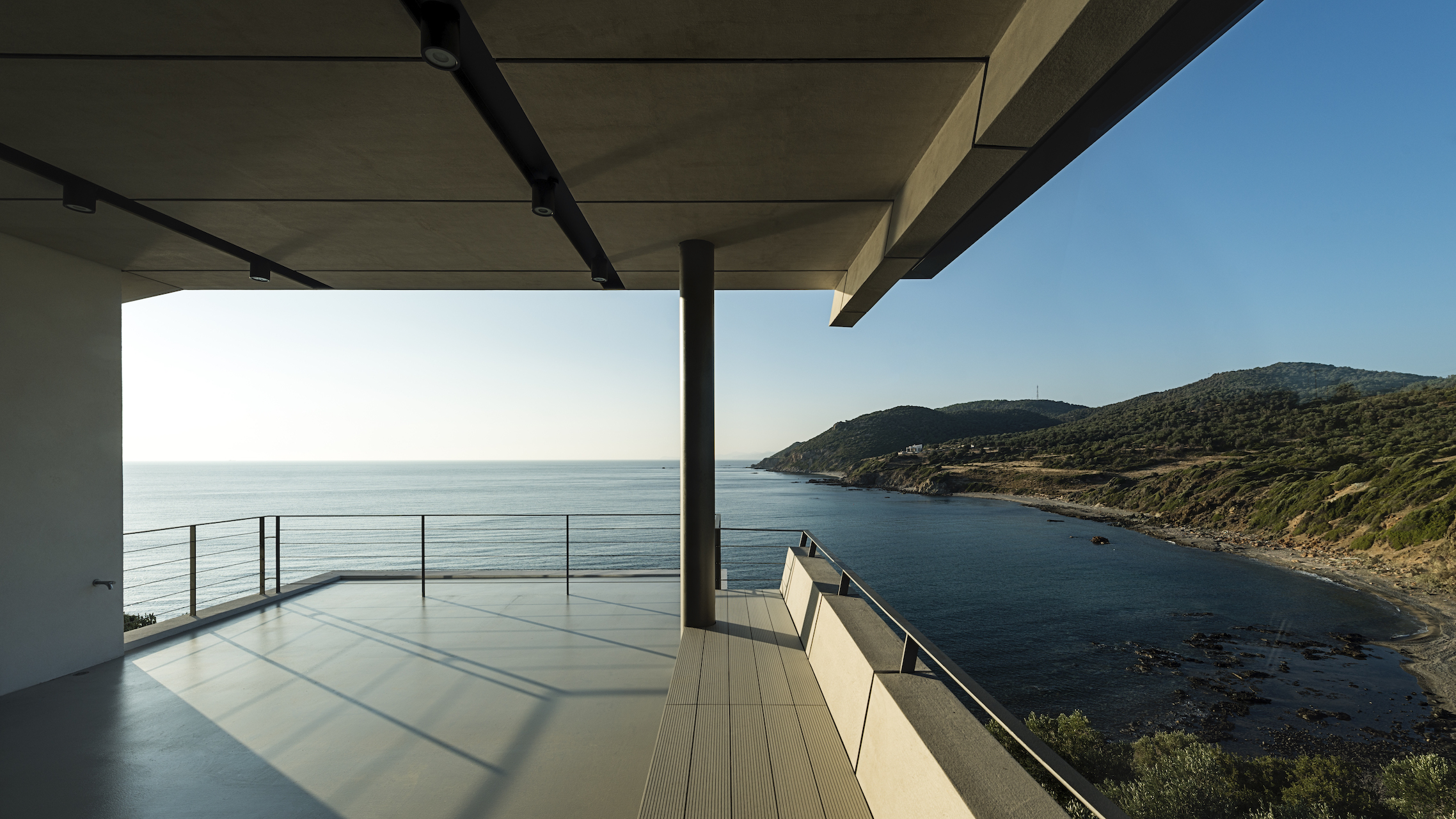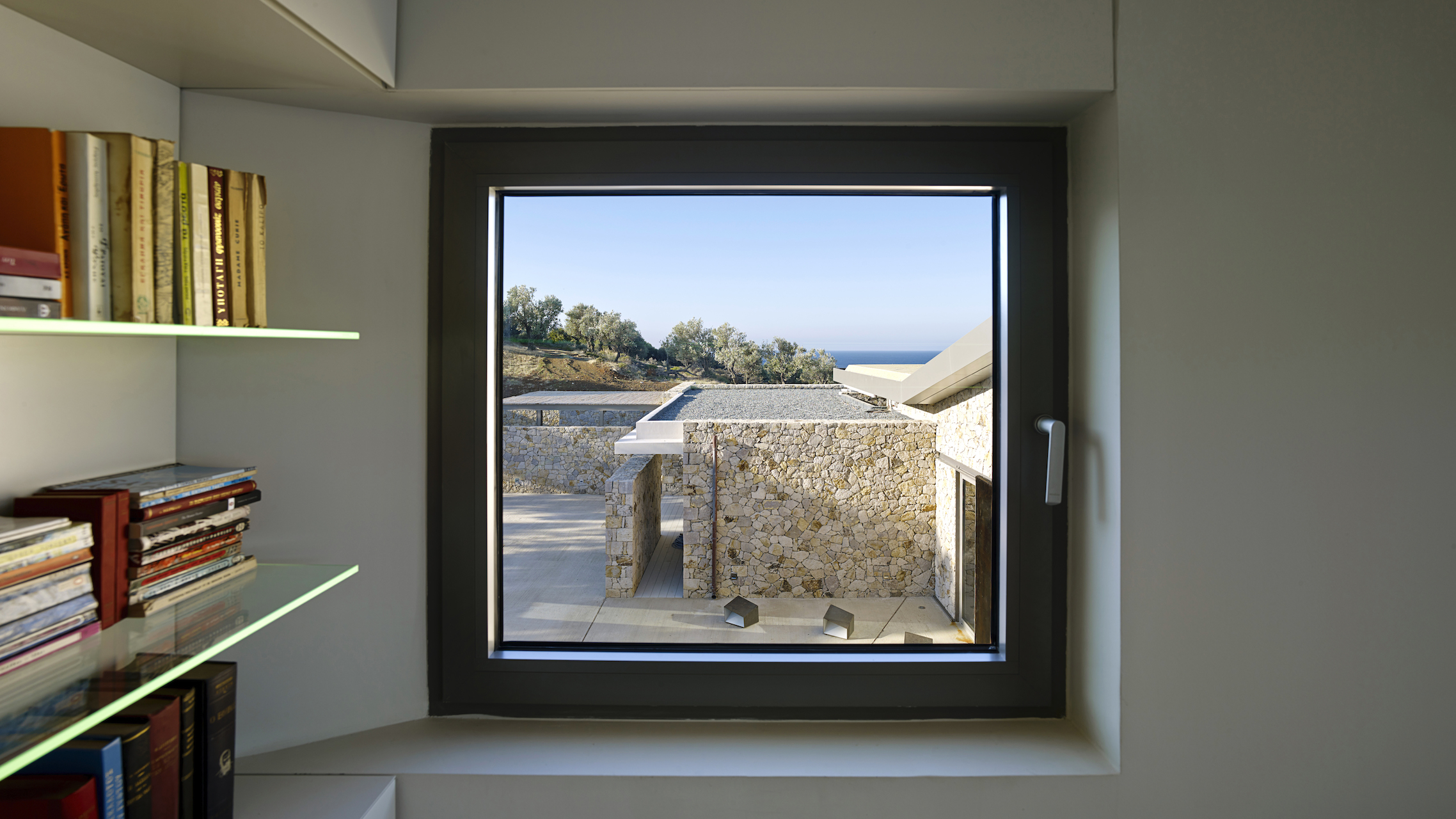 Το κτίριο μοιάζει να φύεται από το έδαφος προς την πλευρά του ελαιώνα και να ίπταται προς τη μεριά της θάλασσας. «Προσεγγίζοντας και διασχίζοντάς το, οι χώροι ξεδιπλώνονται ενώ η θάλασσα εμφανίζεται σταδιακά καθώς καδράρεται αρχικά μέσα από τον συμπαγή πέτρινο τοίχο της όψης, στη συνέχεια από τις σκιερές στοές και τις βαθιές βεράντες που προστατεύουν από τον ήλιο και τελικά η θέα της απελευθερώνεται στον πρόβολο πάνω από το γκρεμό».