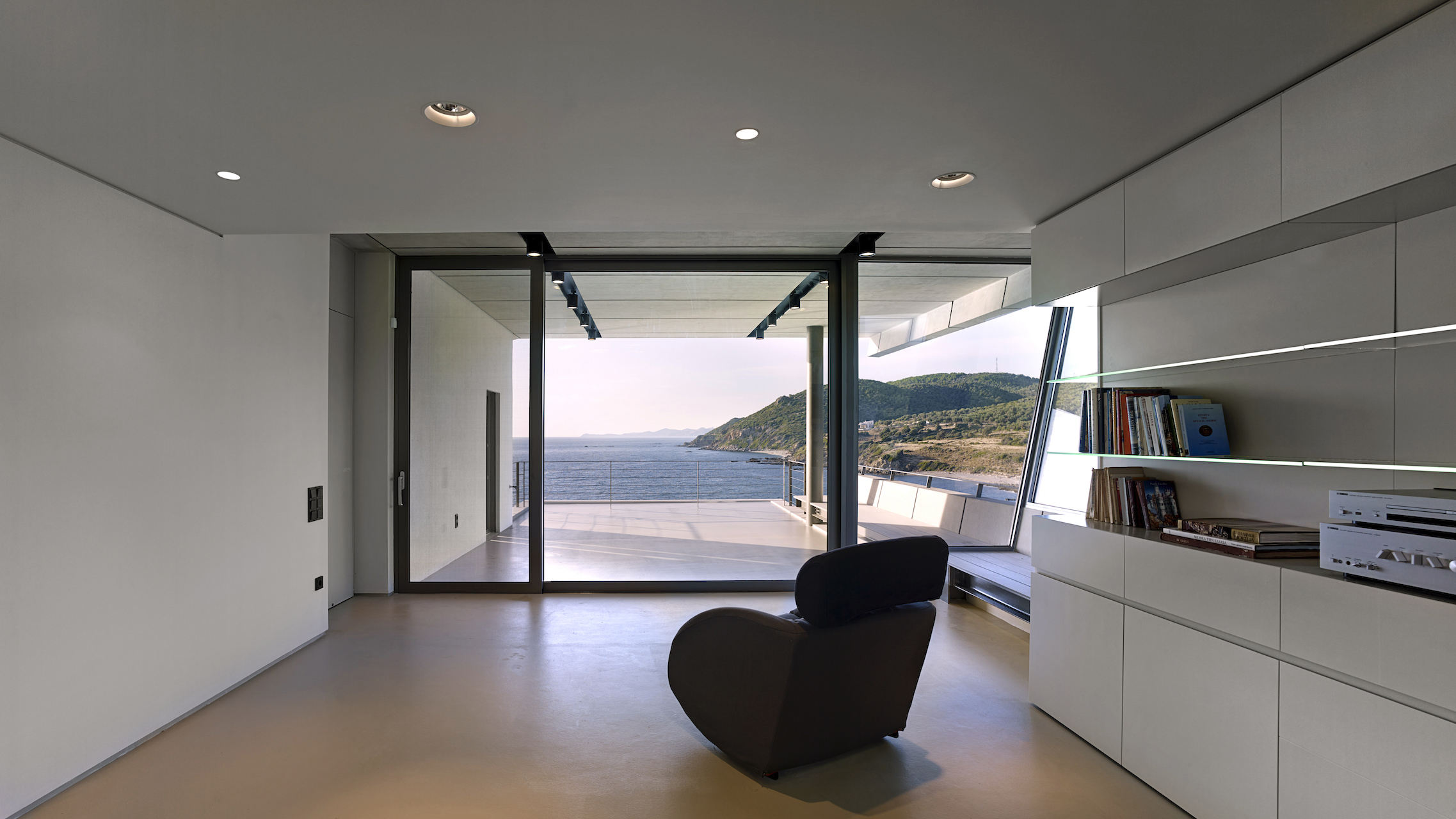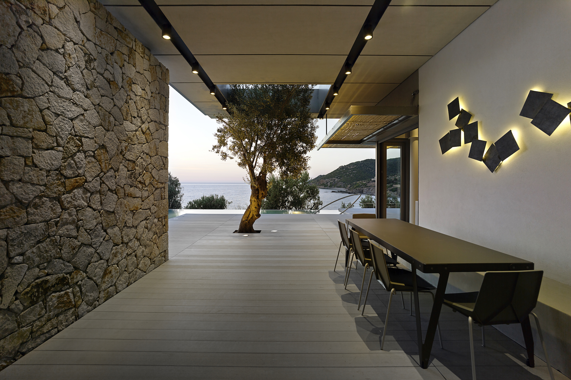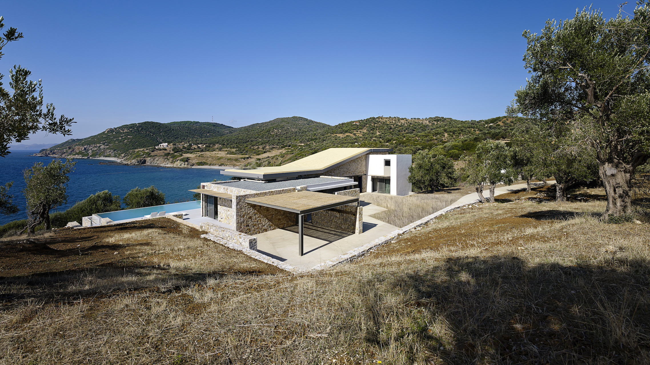 Το κτίριο μοιάζει να φύεται από το έδαφος προς την πλευρά του ελαιώνα και να ίπταται προς τη μεριά της θάλασσας. «Προσεγγίζοντας και διασχίζοντάς το, οι χώροι ξεδιπλώνονται ενώ η θάλασσα εμφανίζεται σταδιακά καθώς καδράρεται αρχικά μέσα από τον συμπαγή πέτρινο τοίχο της όψης, στη συνέχεια από τις σκιερές στοές και τις βαθιές βεράντες που προστατεύουν από τον ήλιο και τελικά η θέα της απελευθερώνεται στον πρόβολο πάνω από το γκρεμό».