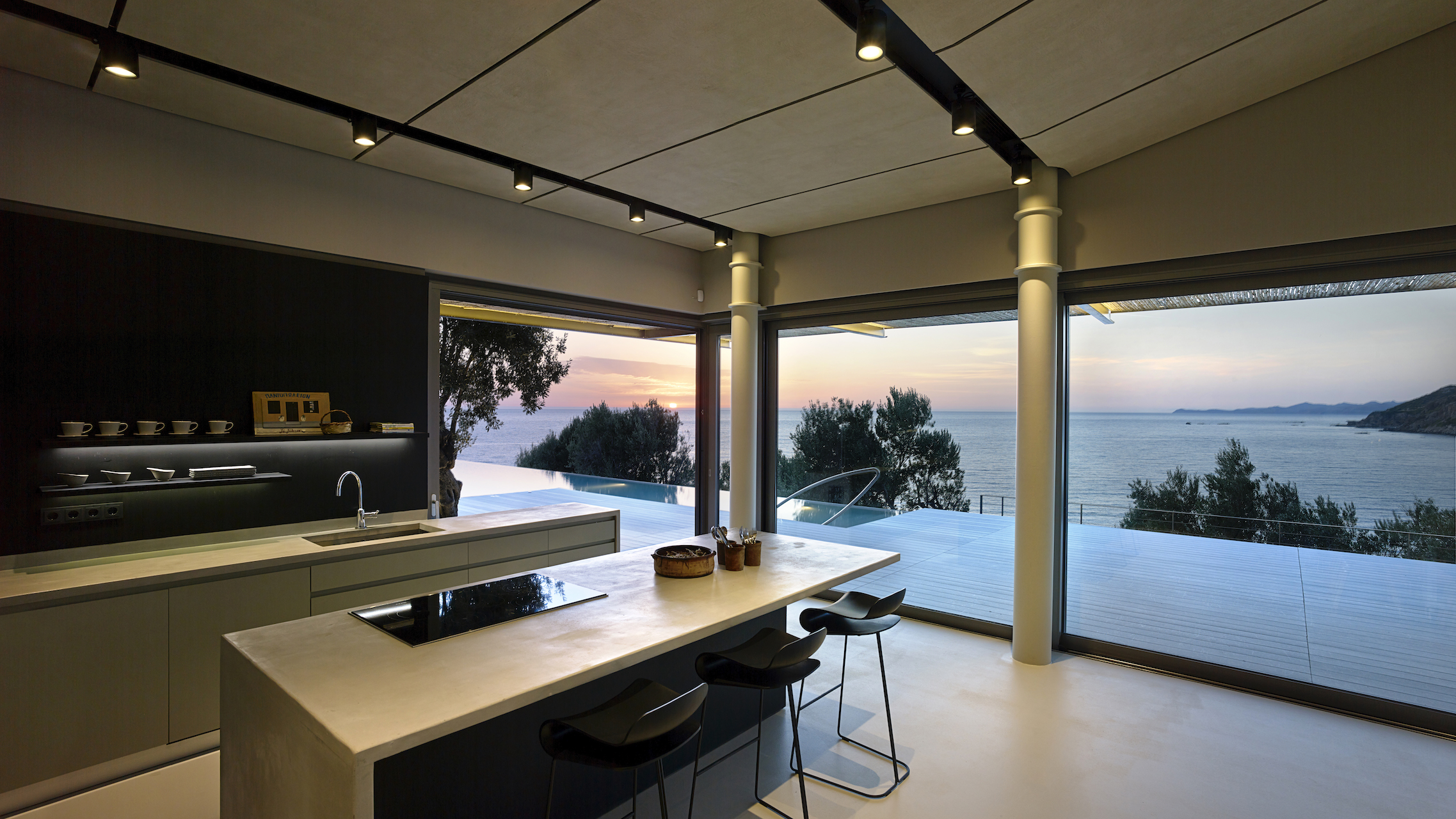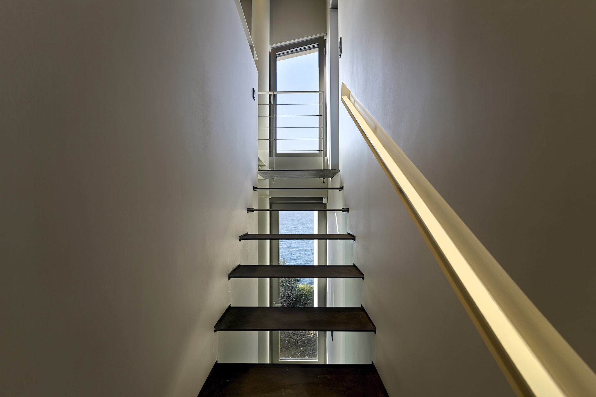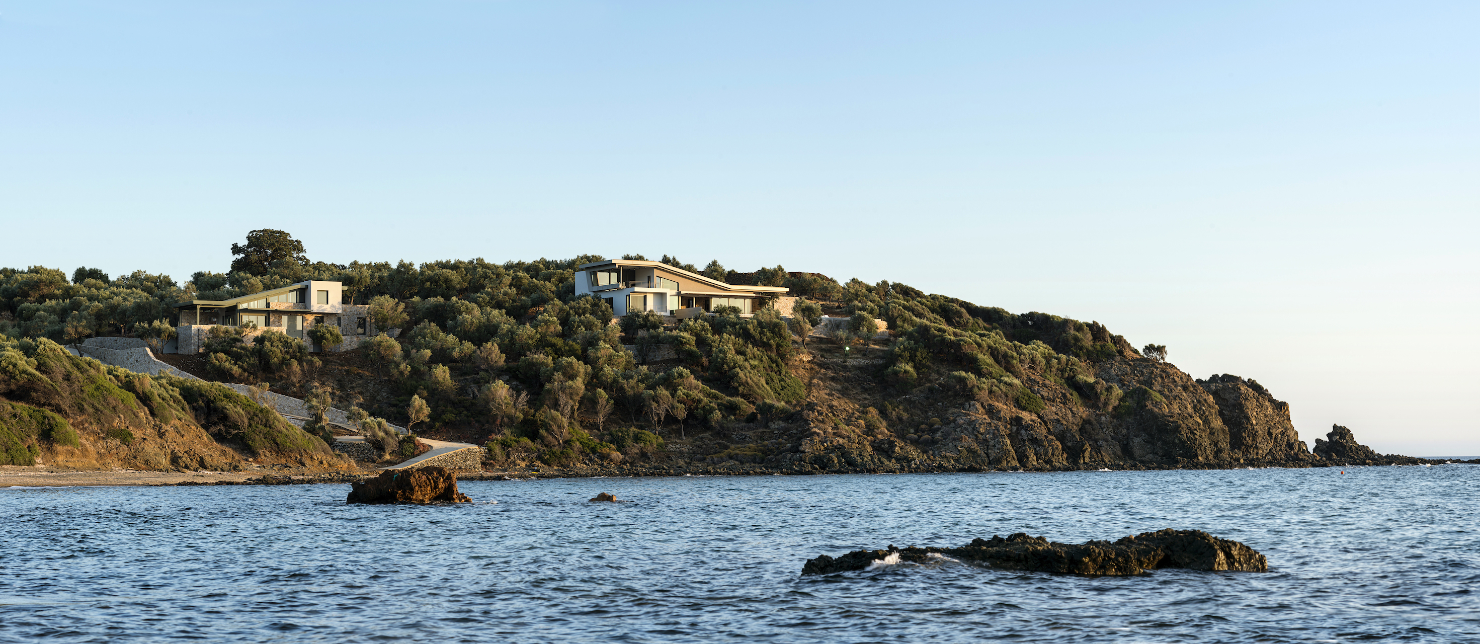 Οι κατοικίες τοποθετήθηκαν παράλληλα στις υψομετρικές καμπύλες, μεταξύ του τέλους του ελαιώνα και της αρχής του παραθαλάσσιου ανάγλυφου λειτουργώντας ως πέρασμα από τη γη στη θάλασσα. «Η ζώνη αυτή επιτρέπει τη ροή του τοπίου και οριοθετείται με μια συμπαγή και μια ελαφριά πλευρά: η όψη προς τον ελαιώνα είναι πέτρινη με ανοίγματα που απομονώνουν στιγμιότυπα του τοπίου, ενώ η όψη που αντικρίζει τη θάλασσα είναι διάφανη και ενιαία».
