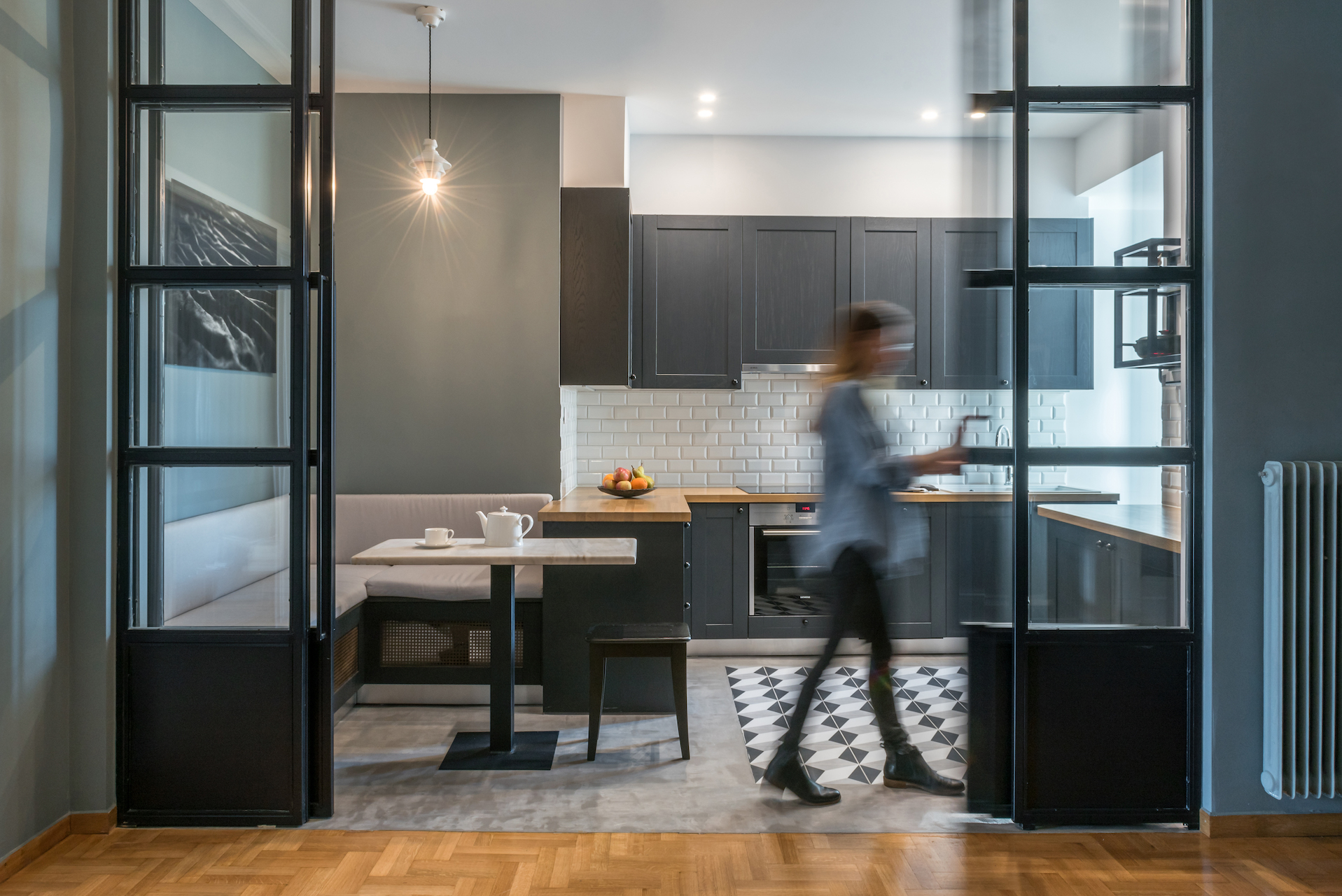Η κλειστή διάταξη του τυπικού αθηναϊκού διαμερίσματος επανεξετάστηκε με στόχο τη δημιουργία χώρων ανοικτών, φωτεινών και με οπτική επαφή. «Βασική αλλαγή στη δομή και στον τρόπο κατοίκησης συντελέστηκε με το άνοιγμα της κουζίνας στους κοινόχρηστους χώρους, καθαιρώντας τις εσωτερικές τοιχοποιίες και καθιστώντας την ενεργό κέντρο της κατοικίας. Οι μεταλλικές συρόμενες πόρτες επιτρέπουν την επιλεκτική απομόνωση του χώρου της κουζίνας, ή το άνοιγμα αυτής προς το σαλόνι», όπως περιγράφει το γραφείο.