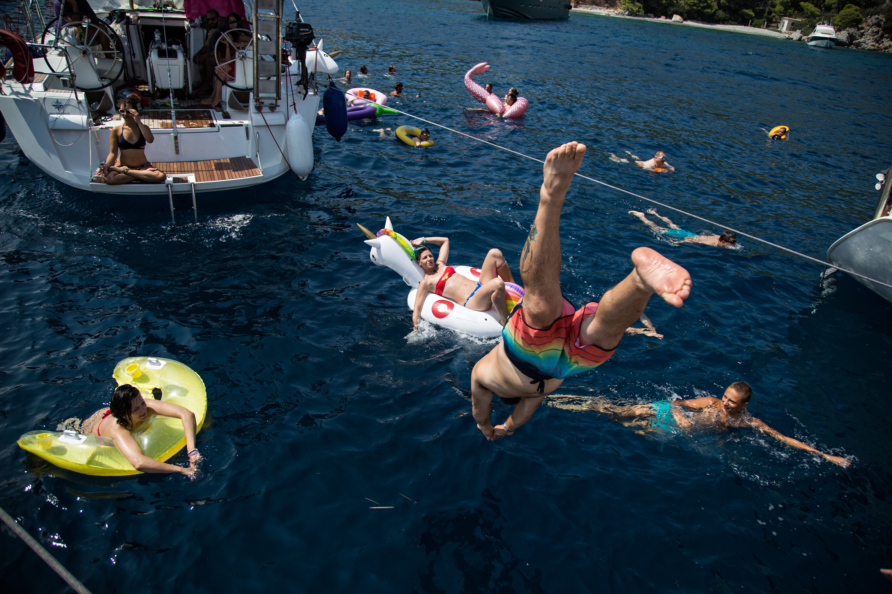 Πριν καλά-καλά το καταλάβουμε βρεθήκαμε να περπατάμε στα στενοσόκακα της Ύδρας και «όλως τυχαίως» οδηγηθήκαμε στην Σπηλιά, το μαγαζί με την πιο ωραία θέα στον Αργοσαρωνικό, όπου στήθηκε άλλο ένα πάρτι και άνθρωποι απ’ όλον τον κόσμο έγιναν ένα, με κοινή γλώσσα την μουσική, τον χορό και φυσικά χωρίς να λείπει ο Mythos, αυτός που ξέρετε ότι «παντού υπάρχει», η αγαπημένη μπύρα όλων μας, που φρόντιζε να κρατάει το κέφι αμείωτο καθ’ όλη την διάρκεια της κρουαζιέρας. Και όσο εμείς χορεύαμε, λίγο πιο κει, οι πιο θαρραλέοι της παρέας, αποφάσιζαν να βουτήξουν στην θάλασσα από τα 15 μέτρα ύψος. Μας είπαν ότι η εμπειρία άξιζε. Ίσως του χρόνου να το τολμήσουμε και οι υπόλοιποι.