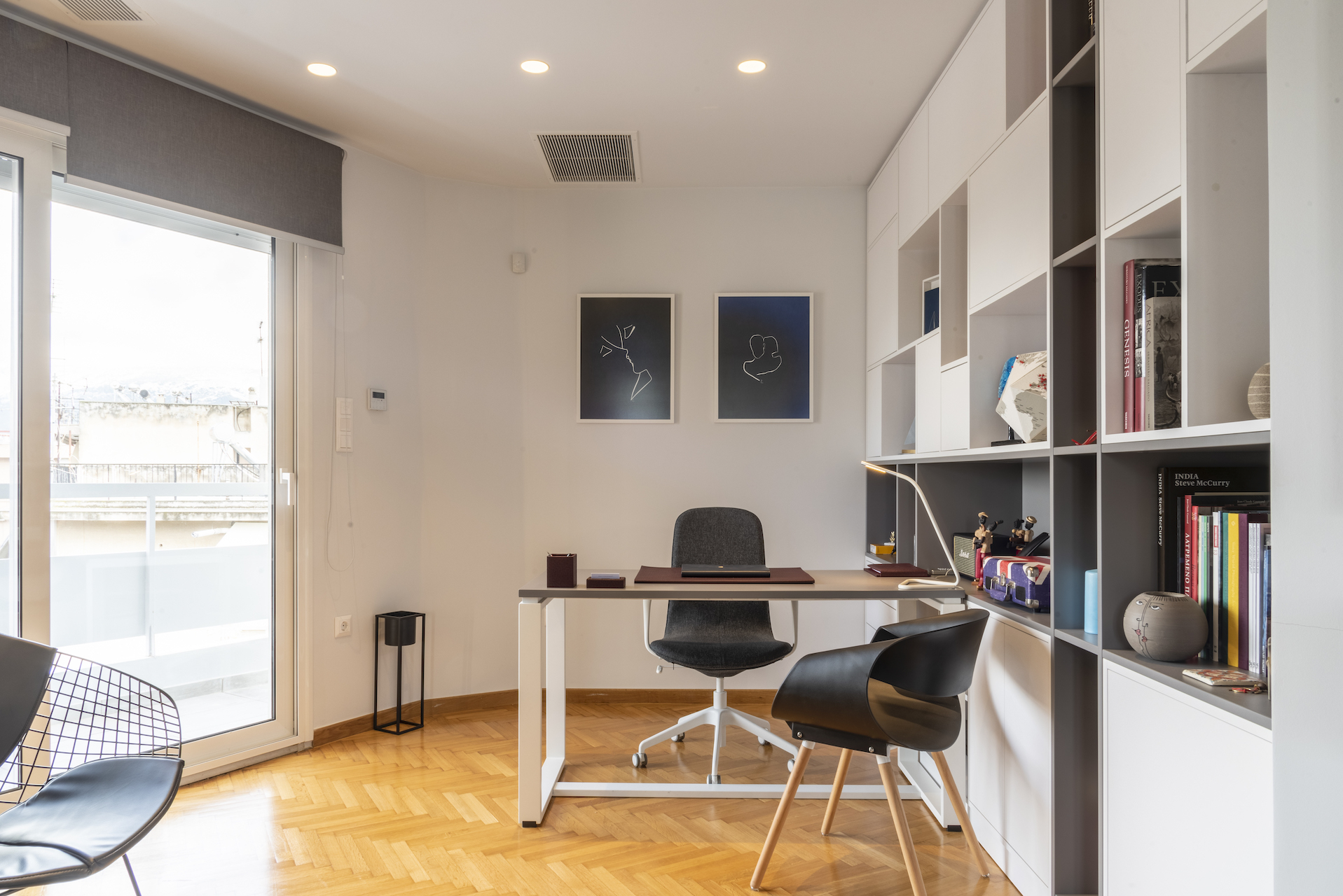 Όσο για το γραφείο που διαμόρφωσαν εντός του διαμερίσματος, το γραφείο αναφέρεται στους παράγοντες που το οδήγησαν στον σχεδιασμό του. «Ο ιδιοκτήτης μοίραζε τον χρόνο του σε διάφορες πόλεις του κόσμου και ως εκ τούτου είχε ανάγκη από έναν χώρο γραφείου όπου θα μπορούσε να δουλέψει από το σπίτι αντί να μεταβεί στο χώρο εργασίας του. Η ιδιαιτερότητα του συγκεκριμένου χώρου είναι ότι ενώ υπήρχε η δυνατότητα να απομονωθεί -με μόνιμα ή κινητά στοιχεία- επιλέχθηκε η ανοιχτή διάταξη καθώς θεωρήθηκε ότι η μεγιστοποίηση του φωτός σε έναν τέτοιο χώρο ευνοεί τη δημιουργικότητα και τη συγκέντρωση», περιγράφει η ομάδα του Asoul.