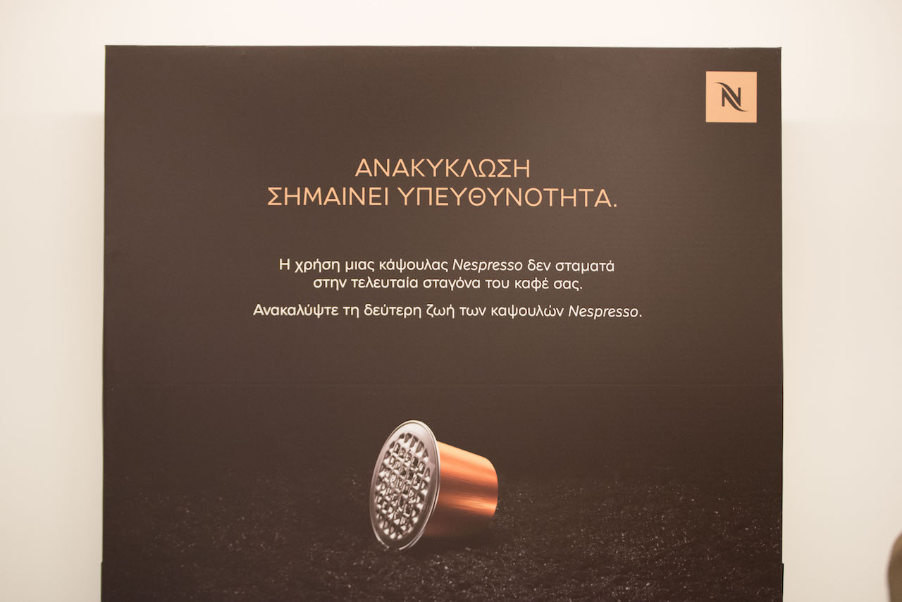 Μου μίλησαν για ζωντανά χρώματα, για τη μεταμόρφωση και αποδόμηση της κάψουλας μέσα στα διαφορετικά στάδια που περνάει, για το ανθρώπινο στοιχείο που είναι παρόν σε αυτό το ταξίδι. Βασικό στοιχείο που βγήκε από τη συζήτηση ήταν αυτό της φύσης, πως ο καφές προέρχεται από τη φύση και τελικά μέσα από το πρόγραμμα ανακύκλωσης επιστρέφει πίσω σε αυτή.