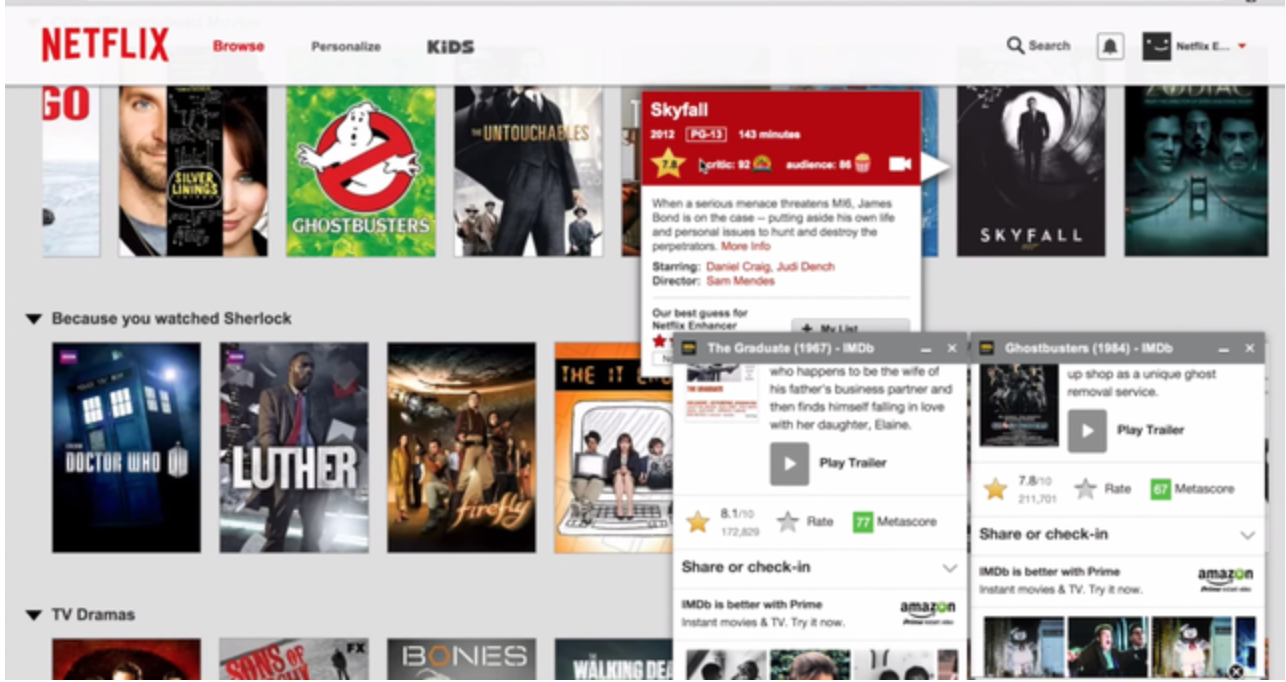 1. Βρες βαθμολογίες, IMD links και trailers από το Rotten Tomatoes. Εάν θέλεις να βελτιώσεις την εμπειρία σου στη στιγμή, πρέπει πρώτα να κατεβάσεις δωρεάν το Netflix Enhancement Suite. Εκεί θα βρεις από βαθμολογίες και αξιολογήσεις του Metacritic και του Rotten Tomatoes μέχρι IMDb προφίλ και trailers.