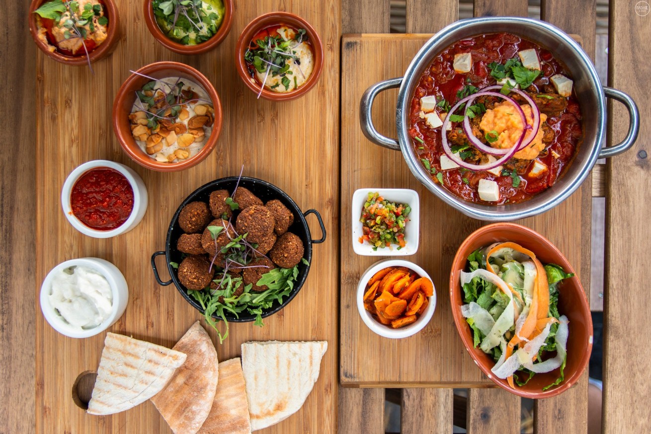 Φαλάφελ, χούμους σε διάφορες παραλλαγές και shashuka όλα vegan, στο Tel Aviv.