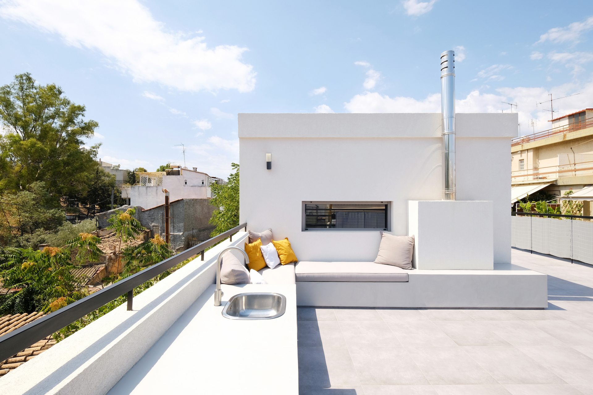 Το 2020 ένα νέο αρχιτεκτονικό γραφείο έδωσε τον δικό του ορισμό στο δώμα, κάνοντας τον ελάχιστο χώρο βιώσιμο. Αυτό που σχεδίασαν οι v+k architects βρίσκεται στην απόληξη μιας τριώροφης πολυκατοικίας στα Άνω Πετραλώνα. Σε μία περιοχή δηλαδή που χαρακτηρίζεται από την συνύπαρξη διαφορετικής κλίμακας κτισμάτων, σε ένα αστικό σκηνικό όπου οι πολυκατοικίες και οι πετρόκτιστες μονοκατοικίες συνυπάρχουν, σε μια γειτονιά στην οποία οι αρχιτέκτονες διαπίστωσαν ότι υπάρχει πλήθος κτιριακού αποθέματος που παραμένει ανενεργό. Φωτογραφία: Δημήτρης Κλεάνθης.