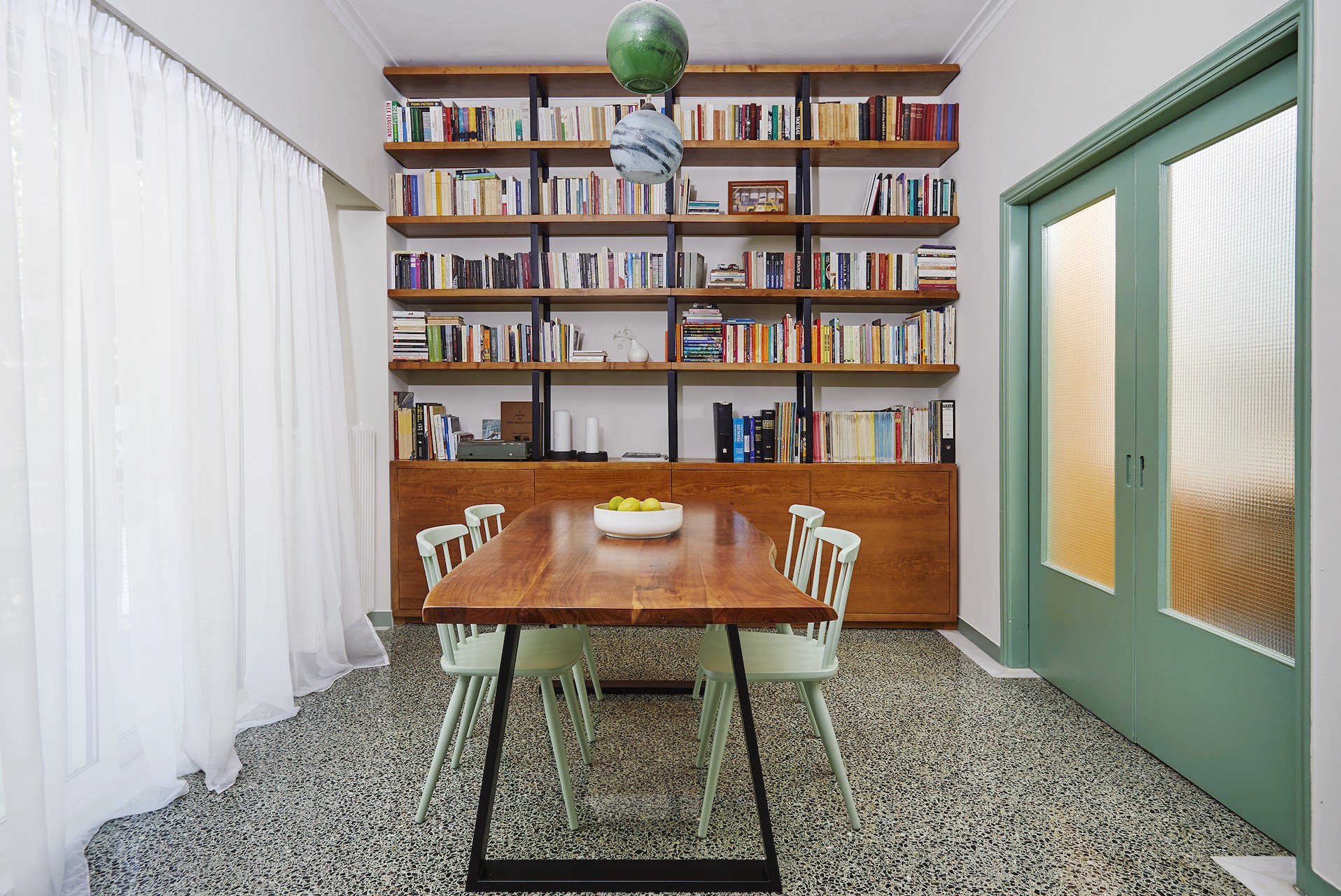 Αυτή η τραπεζαρία είναι η καρδιά ενός πολυβραβευμένου διαμερίσματος στη γειτονιά του Κορυδαλλού. Γιατί το λέμε αυτό; «Αυτή η ενδιάμεση περιοχή είναι ένα θραύσμα έντασης και παύσης. Από αυτό το σημείο συνάθροισης και συνύπαρξης η κατάσταση της διαδοχικής μετάβασης μετατρέπεται σε καθημερινή εμπειρία για την οικογένεια», κατά τους εμπνευστές της. Το γραφείο Plaini and Karahalios Architects μας ξενάγησε σε ένα μικρό διαμέρισμα των ’80s που επανασχεδιάστηκε για να φιλοξενήσει μία τετραμελή οικογένεια, σε ένα σπίτι που χρησιμοποιεί χρώματα για τον διαχωρισμό των λειτουργίων του, διακρίθηκε με σημαντικά βραβεία στην Ελλάδα κι όχι μόνο. Φωτογραφία: Νίκος Παπαγεωργίου.
