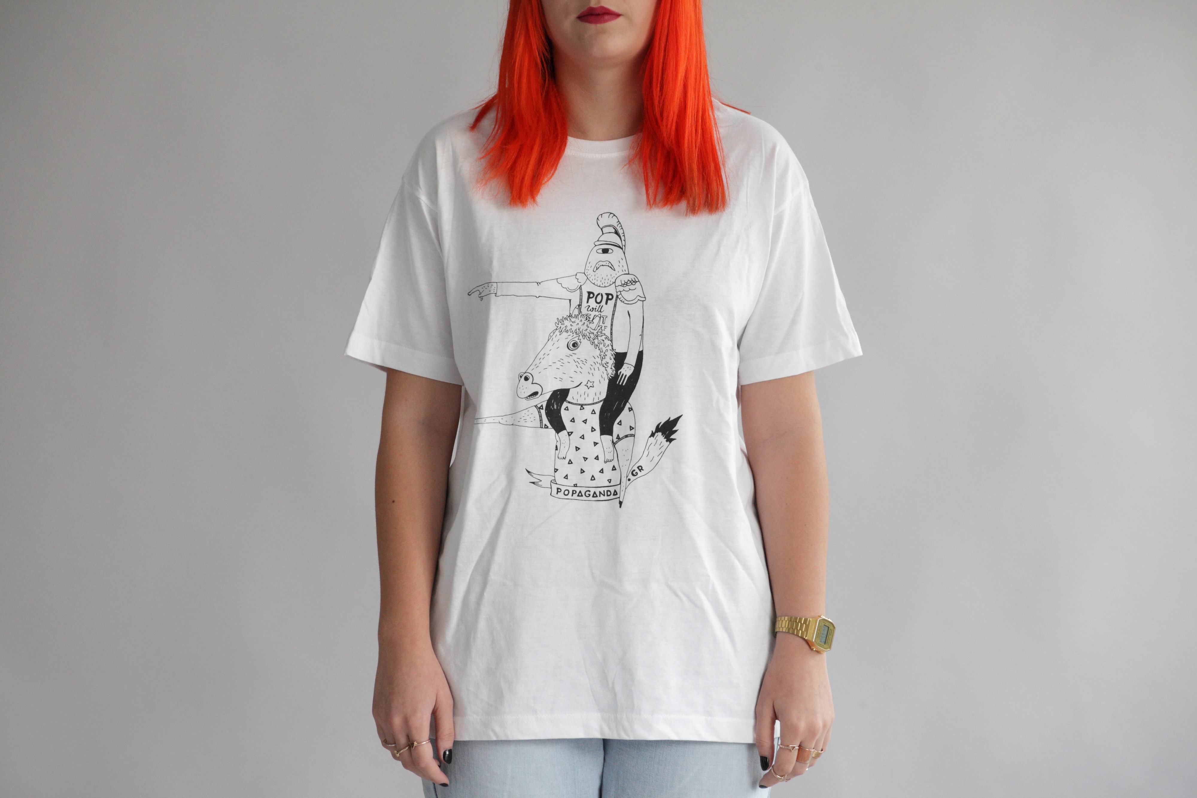 Η γραφίστρια αναζήτησε inisde jokes της συντακτικής ομάδας, μυστικά που κρύβονται πίσω από το logo μας και άλλα πράγματα που χαρακτηρίζουν τους ανθρώπους της Popaganda για να μπορέσει να τα αποτυπώσει σε ένα έξυπνο και fun σχέδιο. Όπως ίσως γνωρίζετε ήδη, τα γραφεία μας βρίσκονται στην οδό Κολοκοτρώνη. Αυτό μας οδήγησε συνειρμικά να επιλέξουμε το μεγάλο στρατηλάτη ως έμβλημά μας. Υπάρχει όμως και κάτι άλλο, ένας αστικός μύθος που λέει ότι το άγαλμα δείχνει προς το Galaxy, το θρυλικό μπαρ της Σταδίου και στέκι όλης της Popaganda (όταν αποκτήσετε το μπλουζάκι μας, ρίξτε επίσης μια ματιά στην εσωτερική ετικέτα και θα εκπλαγείτε ευχάριστα! Πρόκειται για ένα ακόμη trivia, αλλά δε θα σας τα αποκαλύψουμε και όλα!). Η Νόνη φόρεσε στον έφιππο Κολοκοτρώνη ένα T – shirt που γράφει “Pop Will Eat Itself” και αυτό είναι #διπλής, γιατί δεν πρόκειται τόσο για την αγαπημένη μπάντα των ανθρώπων του site, αλλά και για ένα ειρωνικό τσιτάτο που αρεσκόμαστε πολύ να χρησιμοποιούμε εδώ στο γραφείο. Μας αρέσει ο αυτοσαρκασμός γενικότερα, για αυτό παραλίγο να φοράς ένα μπλουζάκι με μια γλάστρα μαϊντανό! Αυτή ήταν μια από τις ιδέες της Νόνης Νέζη, αλλά ο Κολοκοτρώνης νίκησε (και πάλι). Επίσης το άλογο, που έχει μια μουσούδα που θα μπορούσε να είναι μια τρίτη φιγούρα του T-Shirt (!), φοράει και αυτό ένα μπλουζάκι, πολύ χίπστερ, με τριγωνάκια, που όμως δεν είναι άλλο από το “A” του επίσημου logo του site – το οποίο έχει σχεδιάσει ο Γιάννης Καρλόπουλος -.