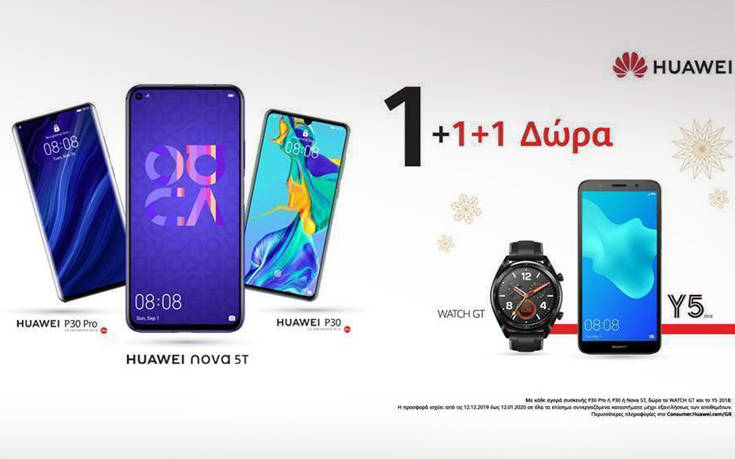 Με μια μόνο αγορά αποκτάς 1 + 1 + 1 τεχνολογικά στολίδια. Δηλαδή, από τις 12 Δεκεμβρίου 2019 μέχρι τις 12 Ιανουαρίου 2020, αγοράζοντας ένα smartphone Huawei P30 Pro ή Huawei P30 ή το νέο πεντακάμερο Huawei NOVA 5T, αποκτάτε 2 δώρα! Ένα smartwatch Huawei Watch GT και ένα smartphone Huawei Y5 2018.