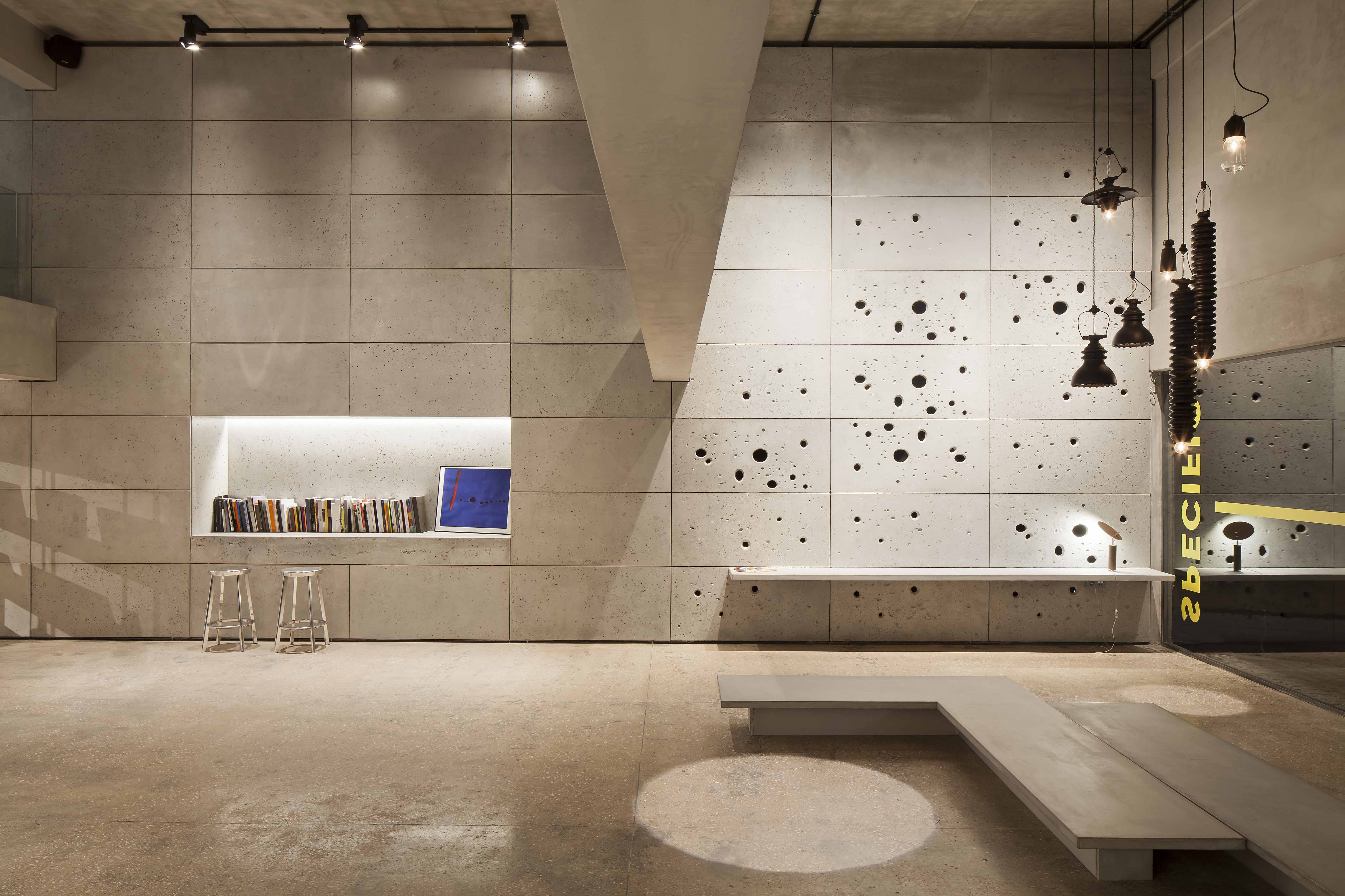 Τα (περίπου) 250 τετραγωνικά μέτρα του αναπτύσσονται σε δύο επίπεδα. Είσοδος, lobby – υποδοχή, reception, dark room, αίθριο με άνυδρο κήπο και πράσινο τοίχο κάθετης φύτευσης μεγάλου ύψους καθώς και κοινόχρηστα WC είναι τα στοιχεία που απαρτίζουν το πρώτο επίπεδο.