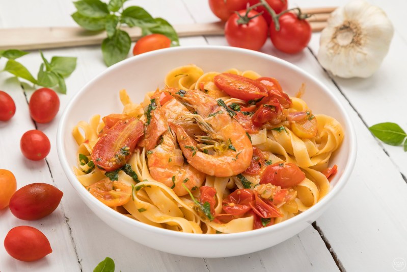 Οι γαρίδες θέλουν ελάχιστο ψήσιμο, η ντοματόσαλτσα να είναι «ζωντανή» (γι’ αυτό χρησιμοποιούμε ολόγλυκα ντοματίνια), τα ζυμαρικά να είναι καλής ποιότητας και να «κρατάνε» κι έπειτα ποντάρεις στα αρωματικά: σκόρδο, πικάντικο τσίλι, πάπρικα, τσίπουρο και φρέσκα μυρωδικά.