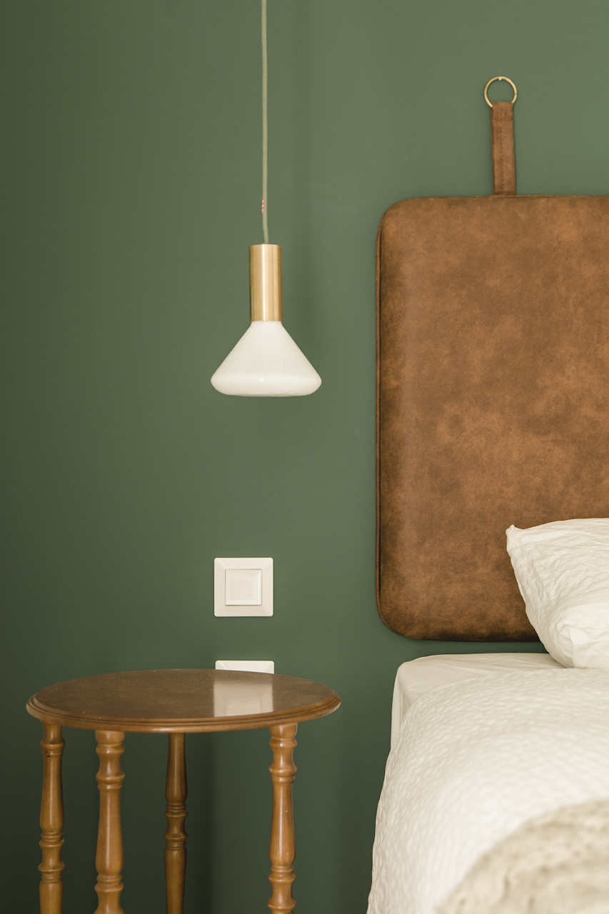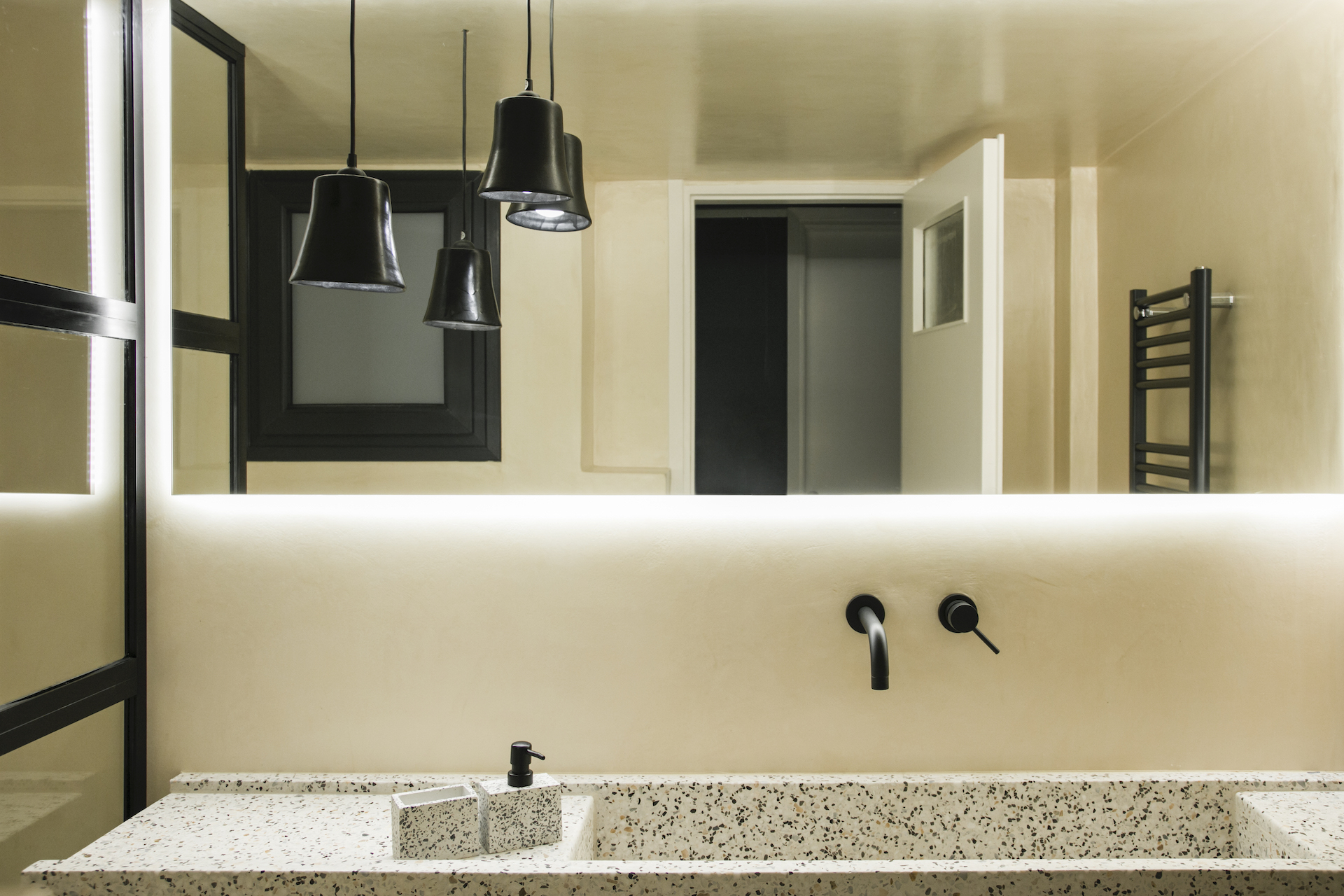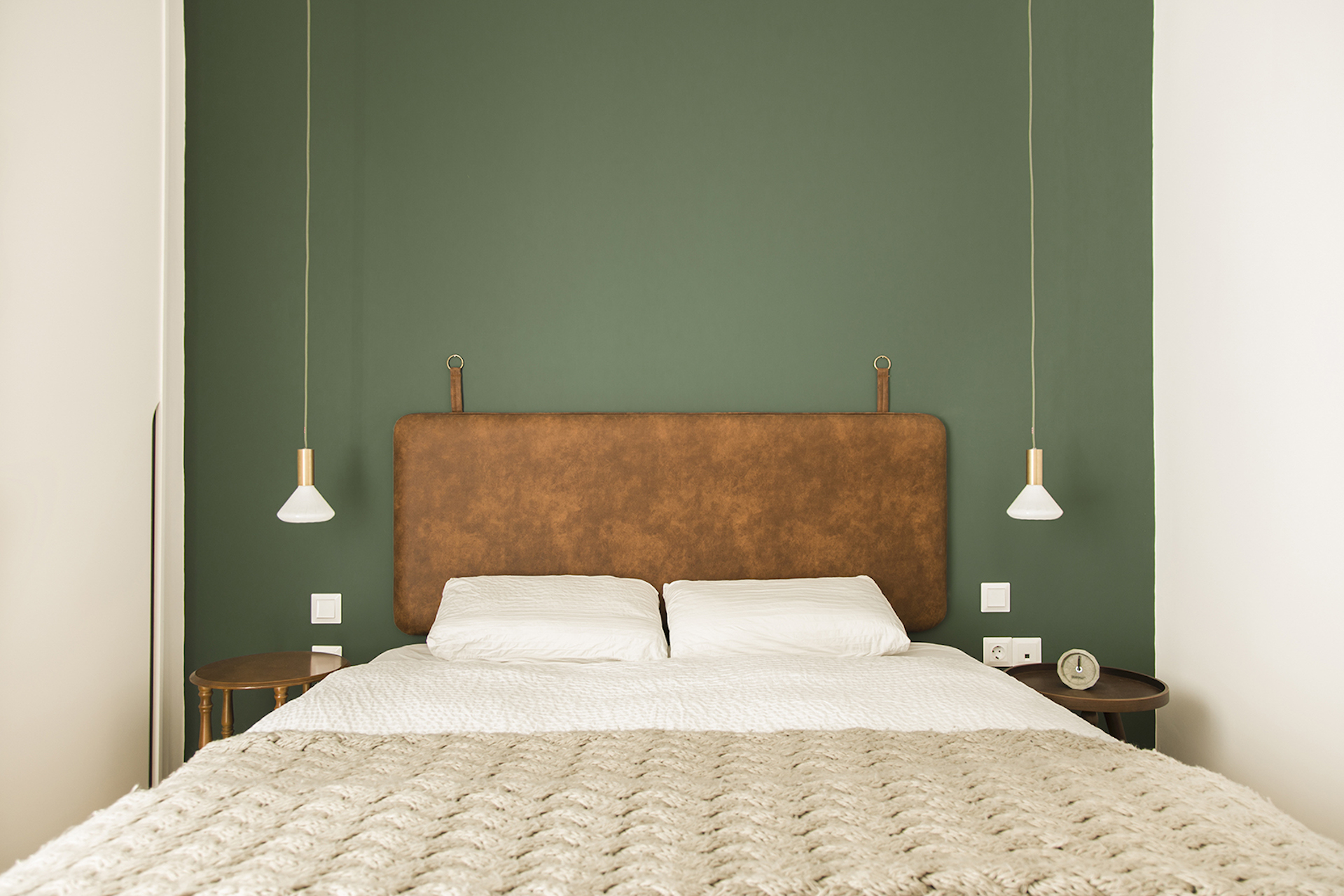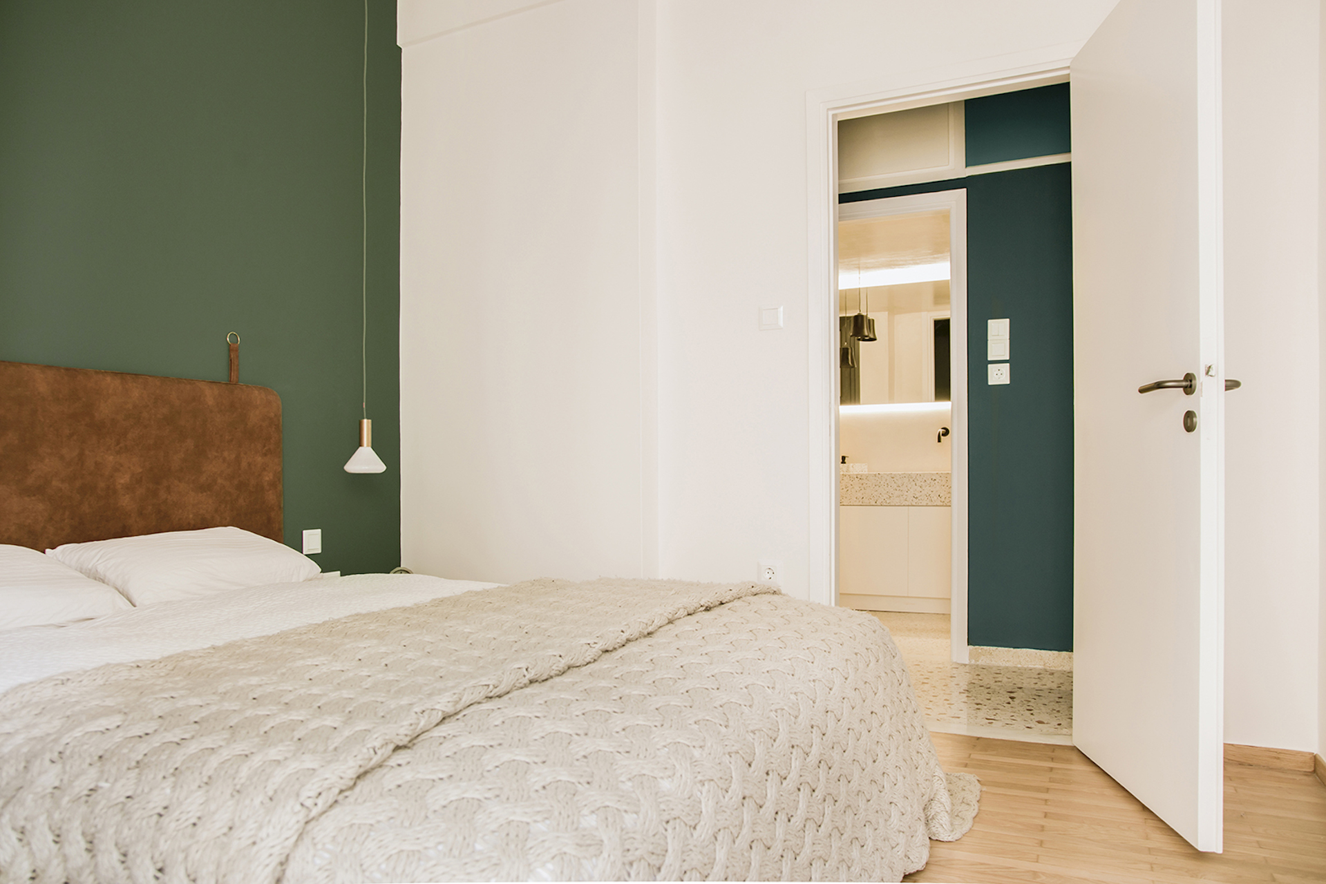 Στην κρεβατοκάμαρα την παράσταση κλέβει το σκούρο πράσινο που επιλέχθηκε για τον τοίχο και ο συνδυασμός του με το ξύλο και τις γήινες αποχρώσεις. Μια ισορροπημένη και ταυτόχρονα δυναμική σύνθεση που ησυχάζει με το ανοιχτό γκρι του χολ και συνεχίζεται στο μπάνιο δίνοντας όμως τον πρώτο λόγο στον ασπρόμαυρο διάλογο που πυροδοτείται από το μωσαϊκό.«Χρησιμοποιήσαμε πατητή τσιμεντοκονία και μωσαϊκό όχι μόνο στο δάπεδο αλλά και στην ειδική κατασκευή του νιπτήρα, η οποία εκμεταλλεύεται στο μέγιστο το μήκος του μπάνιου».