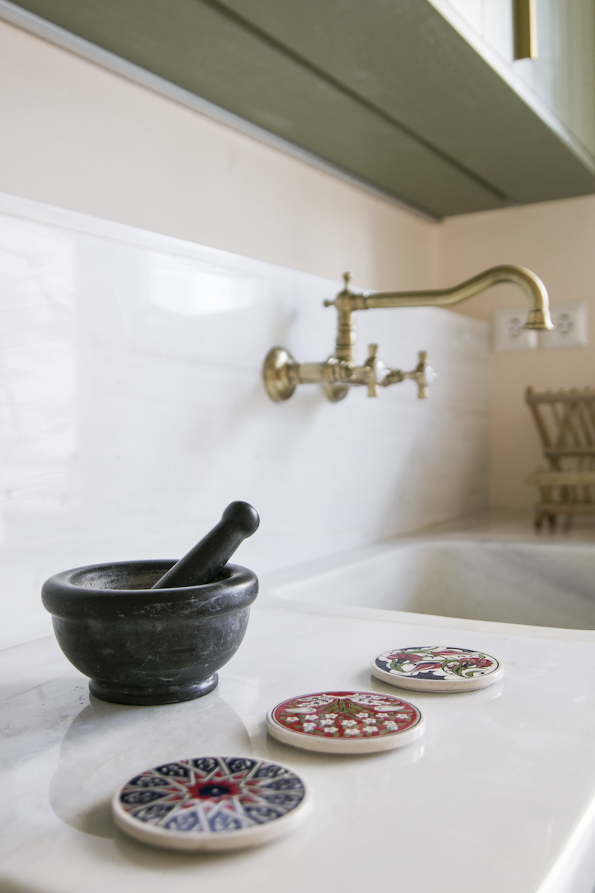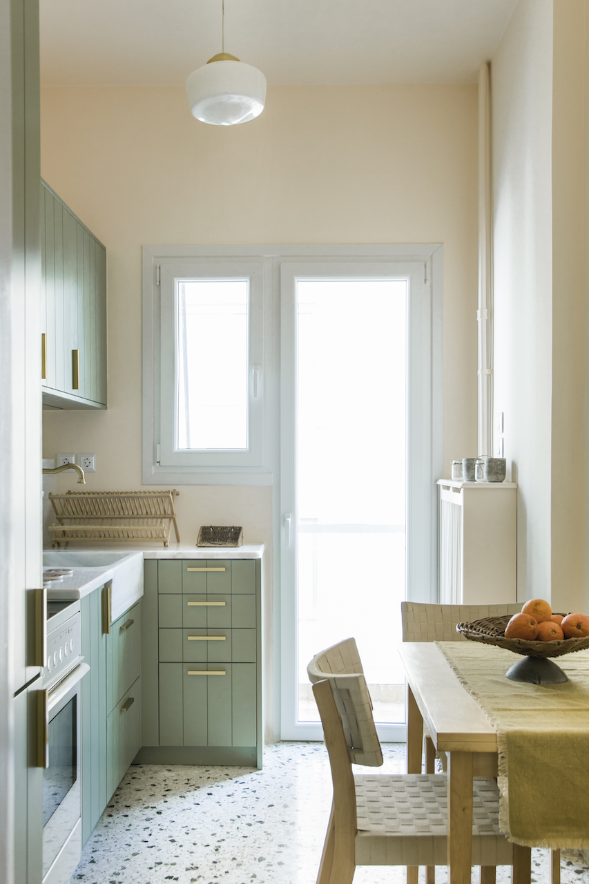 Το απαλό σομόν αναλαμβάνει να δώσει την αίσθηση ηρεμίας και την απαραίτητη φωτεινότητα στην κουζίνα. «Σε αυτόν τον χώρο κυρίαρχο κομμάτι είναι ο μαρμάρινος νεροχύτης που βρισκόταν ήδη εκεί, κάτω από το παράθυρο. Για λειτουργικούς λόγους του αλλάξαμε θέση κάτι που τελικά τον ανέδειξε καθώς ενσωματώθηκε με το μαρμάρινο προστατευτικό στον τοίχο και τον πάγκο».