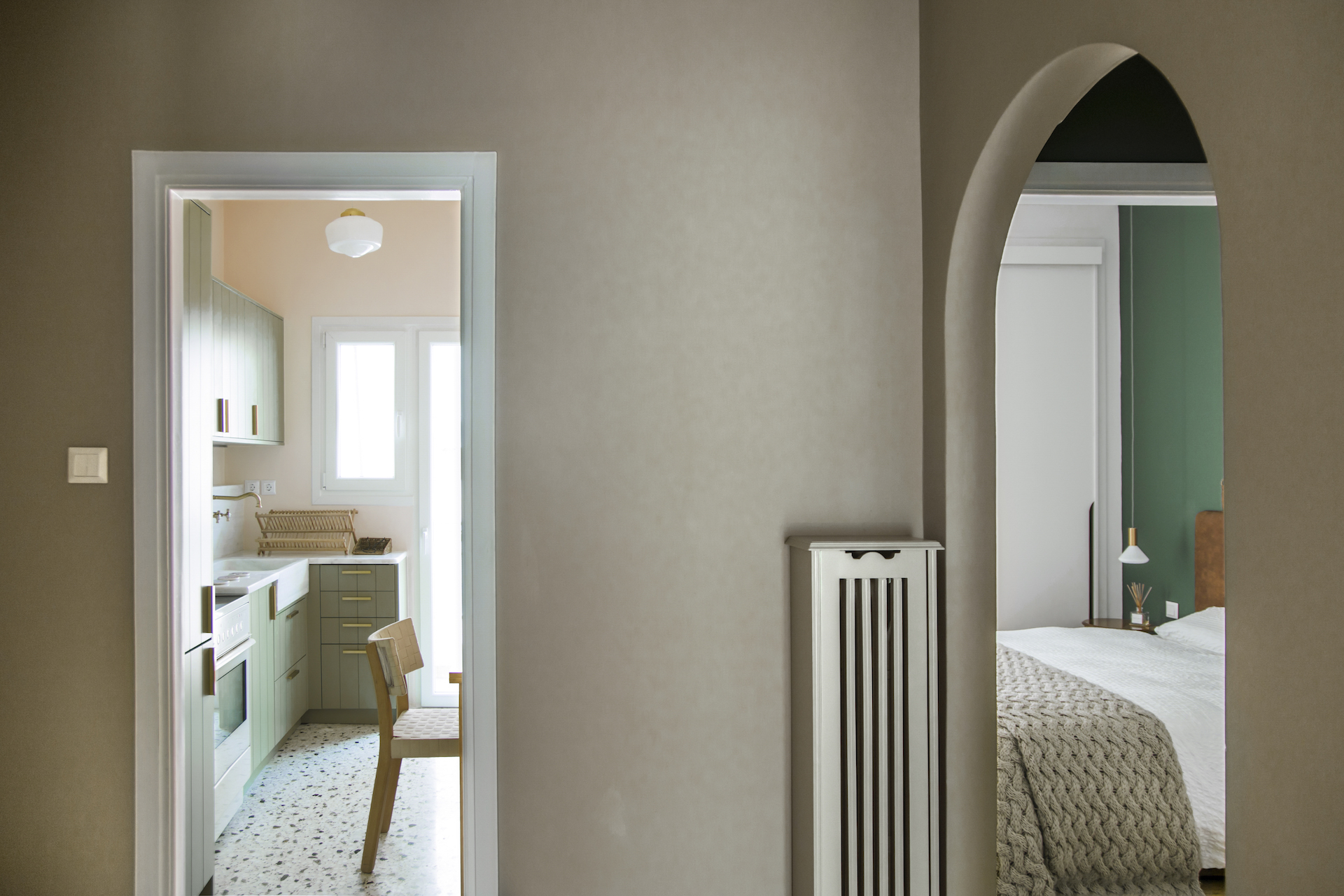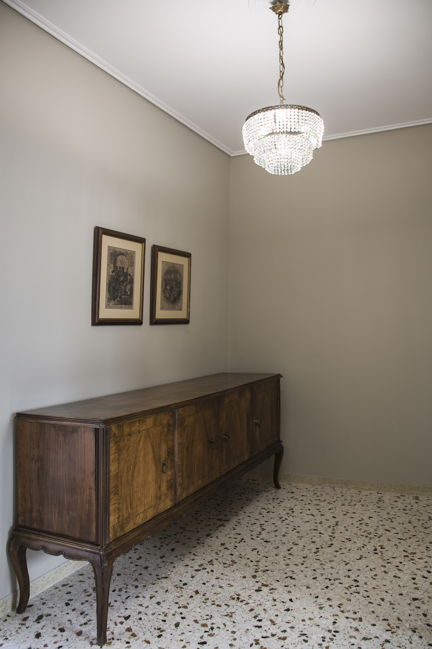 Το διαμέρισμα αποτελείται από έναν χώρο εισόδου, ένα καθιστικό, μια κουζίνα, μια κρεβατοκάμαρα και ένα μικρό μπάνιο. Η διαρρύθμιση διατηρήθηκε με τη μόνη παρέμβαση να πραγματοποιείται στη σύνδεση του χολ με την κρεβατοκάμαρα όπου αρχικά υπήρχε μια συρόμενη πόρτα. «Την αφαιρέσαμε και την αντικαταστήσαμε με μια καμάρα ώστε να εξασφαλίζουμε την αίσθηση του ανοιχτού χώρου, αξιοποιώντας παράλληλα ένα αρχιτεκτονικό στοιχείο με αναφορές σε εκείνη την εποχή» εξηγεί η Eβελίνα Χατζηγούλα.