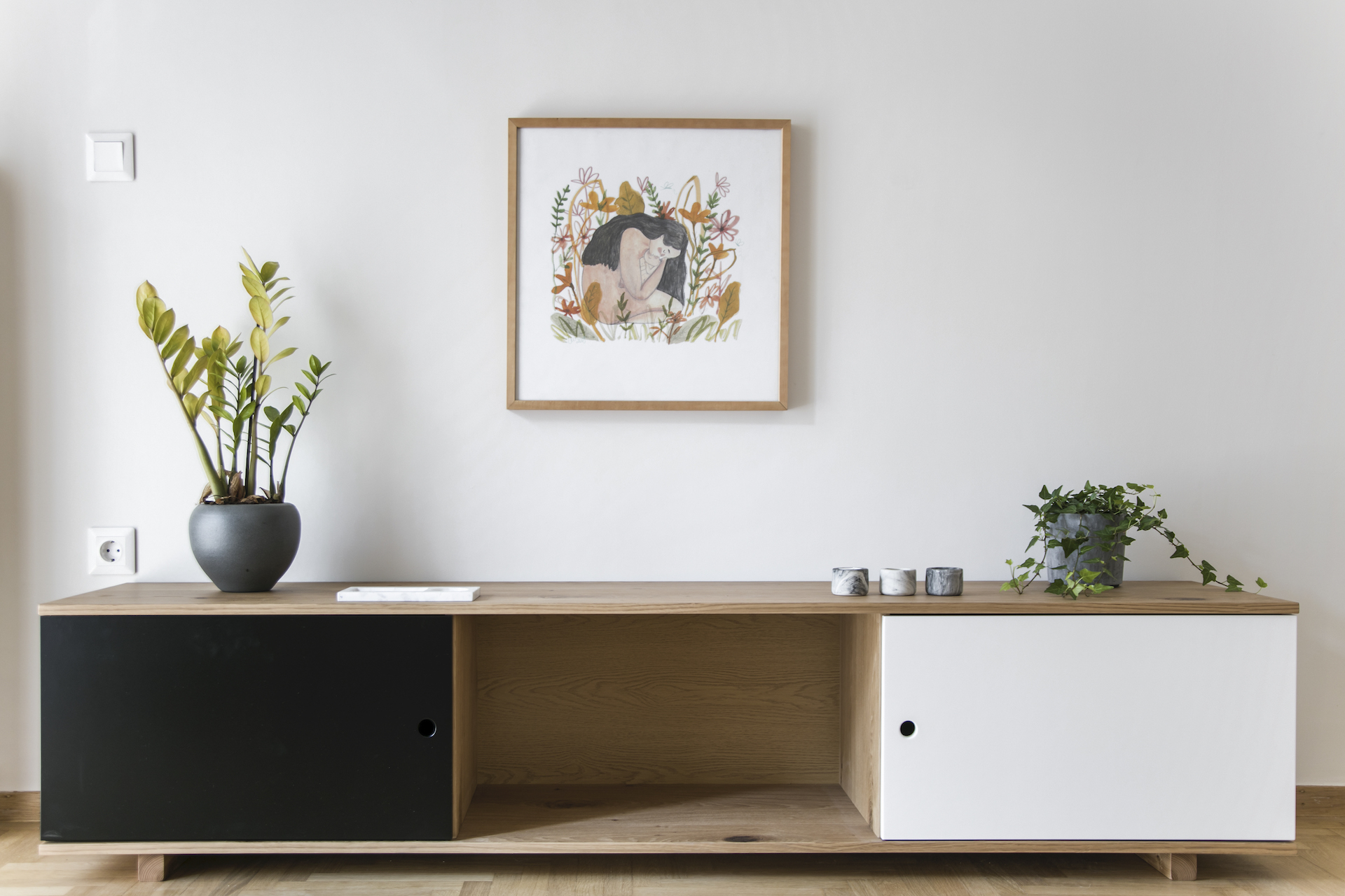 Το καθιστικό είναι ένας χώρος όπου κυριαρχεί η αίσθηση της ηρεμίας που προκύπτει μέσα από την χρωματική του παλέτα -τόνοι του σπασμένου λευκού -αλλά και της διακοσμητικής του ταυτότητας που παραπέμπει στην καθαρότητα και απλότητα του σκανδιναβικού σχεδιασμού. Παράλληλα, έχει προβλεφθεί η λειτουργία του και ως δωμάτιο φιλοξενίας έχοντας μια κλειστή ντουλάπα, μαζί με την ανοιχτή βιβλιοθήκη αλλά και τον καναπέ που ανοίγει και μετατρέπεται σε κρεβάτι.