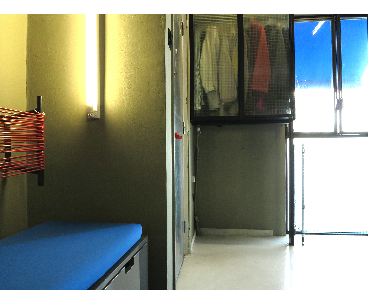 «Η πατητή τσιμεντοκονία που έχει εφαρμοστεί στον τοίχο διαφοροποιείται χρωματικά από εκείνη του δαπέδου και συμπληρώνεται από ένα μπλε χρώμα (στην απόχρωση του κοβαλτίου) στην οροφή. Oι πολλές γυάλινες επιφάνειες ευνοούν κι εδώ τη λειτουργία του φυσικού φωτός και την διαπερατότητα από χώρο σε χώρο, προκαλώντας ένα ευχάριστο συναίσθημα, δίνοντας την εντύπωση ενός μεγαλύτερου χώρου».