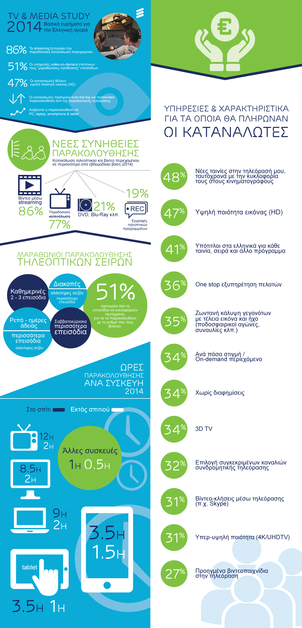 Η έρευνα δείχνει για την ελληνική αγορά μια σαφή προτίμηση των καταναλωτών για streaming περιεχομένου (86%) έναντι της παραδοσιακής κατανάλωσης περιεχομένου (77%) με την παραδοσιακή να νοείται αυτή της τηλεόρασης.