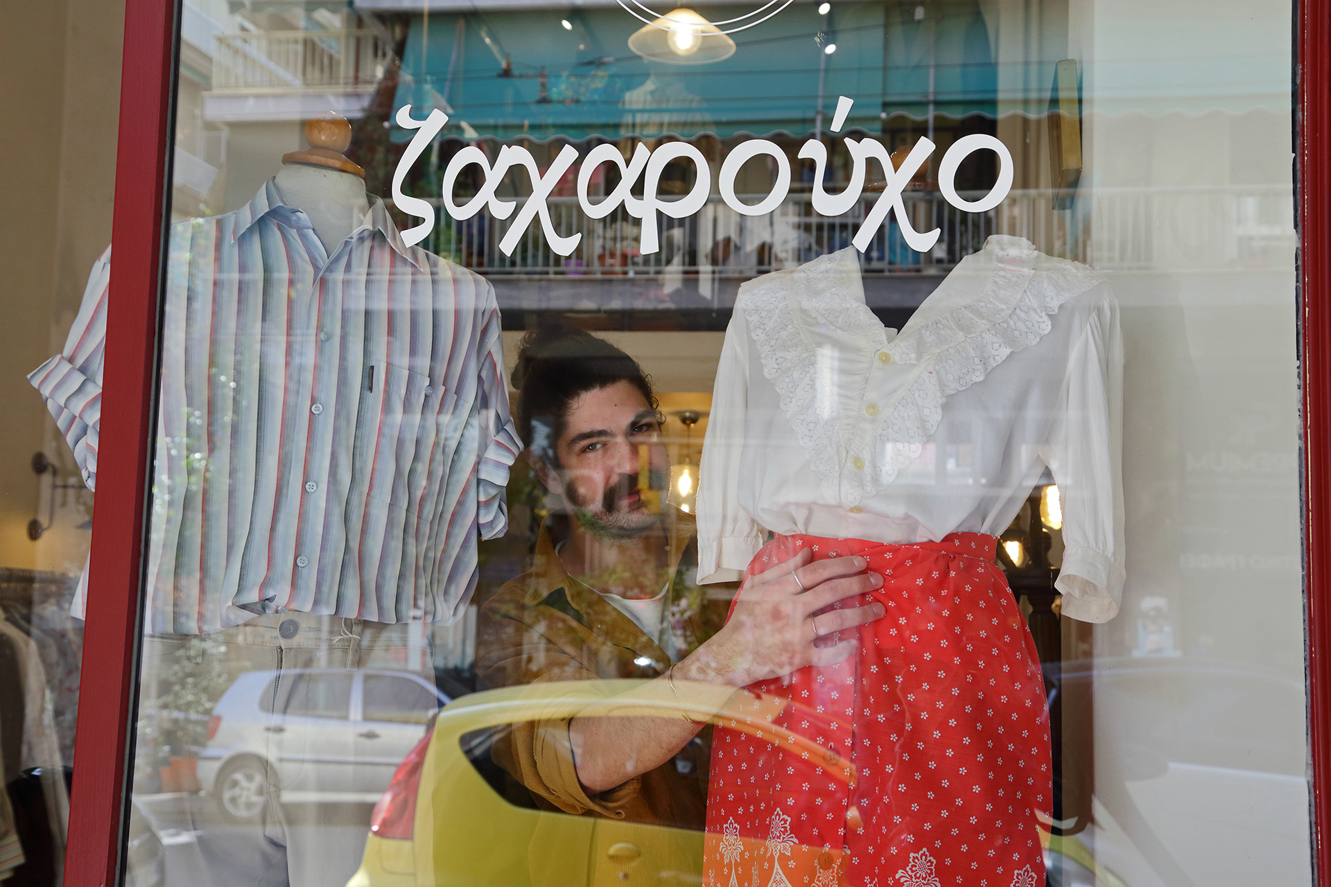 Ο Νικόλας ζει στο Κουκάκι εδώ και 32 χρόνια, από τότε που γεννήθηκε. Σε μια βόλτα στη γειτονιά κι ενώ του είχε μπει η ιδέα να ανοίξει το Ζαχαρούχο, πέρασε μπροστά από τον χώρο που στεγάζεται τώρα και είδε ένα μπορντό-ροζ πάτωμα από μωσαϊκό. «Αυτό ήταν. Άρχισα να ψάχνω πώς θα μπορούσα να το δω μέσα και αν διατίθεται για κατάστημα. Ύστερα από τρεις μήνες περίπου, κατάφερα να το δω και διαπίστωσα ότι το μαγαζί είχε τη μορφή που είχα φανταστεί, έναν μακρόστενο δηλαδή χώρο με μια νοητή γραμμή, από τη μια μεριά τα ρούχα και από την άλλη το καφέ, με ένα παταράκι για επιπλέον παρουσίαση ρούχων. Ήταν για δέκα χρόνια κλειστό. Παλιά πουλούσε αθλητικά είδη και ακόμη παλιότερα ήταν κασετάδικο».