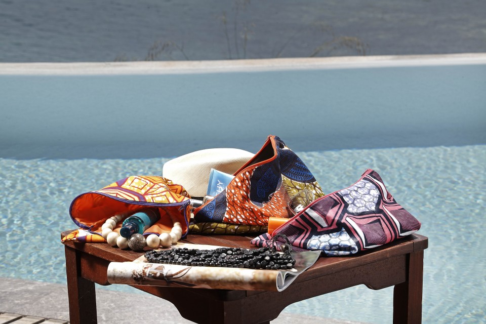 Πέρα από τις πετσέτες υπάρχουν και multi clutch με αφρικάνικο κερωμένο ύφασμα σε 3 tribal patterns και με αδιάβροχη εσωτερική επένδυση, ώστε να βάζουμε τα βρεγμένα μας μαγιό αφού αλλάξουμε, τα αντηλιακά μας και ότι άλλο μπορεί να χρειαζόμαστε στην παραλία. Χάρη στο καλοκαιρινά, εξωτικά τους σχέδια μπορούμε άνετα να τα χρησιμοποιήσουμε και ως clutch για τη βραδινή, χαλαρή μας έξοδο στο νησί.