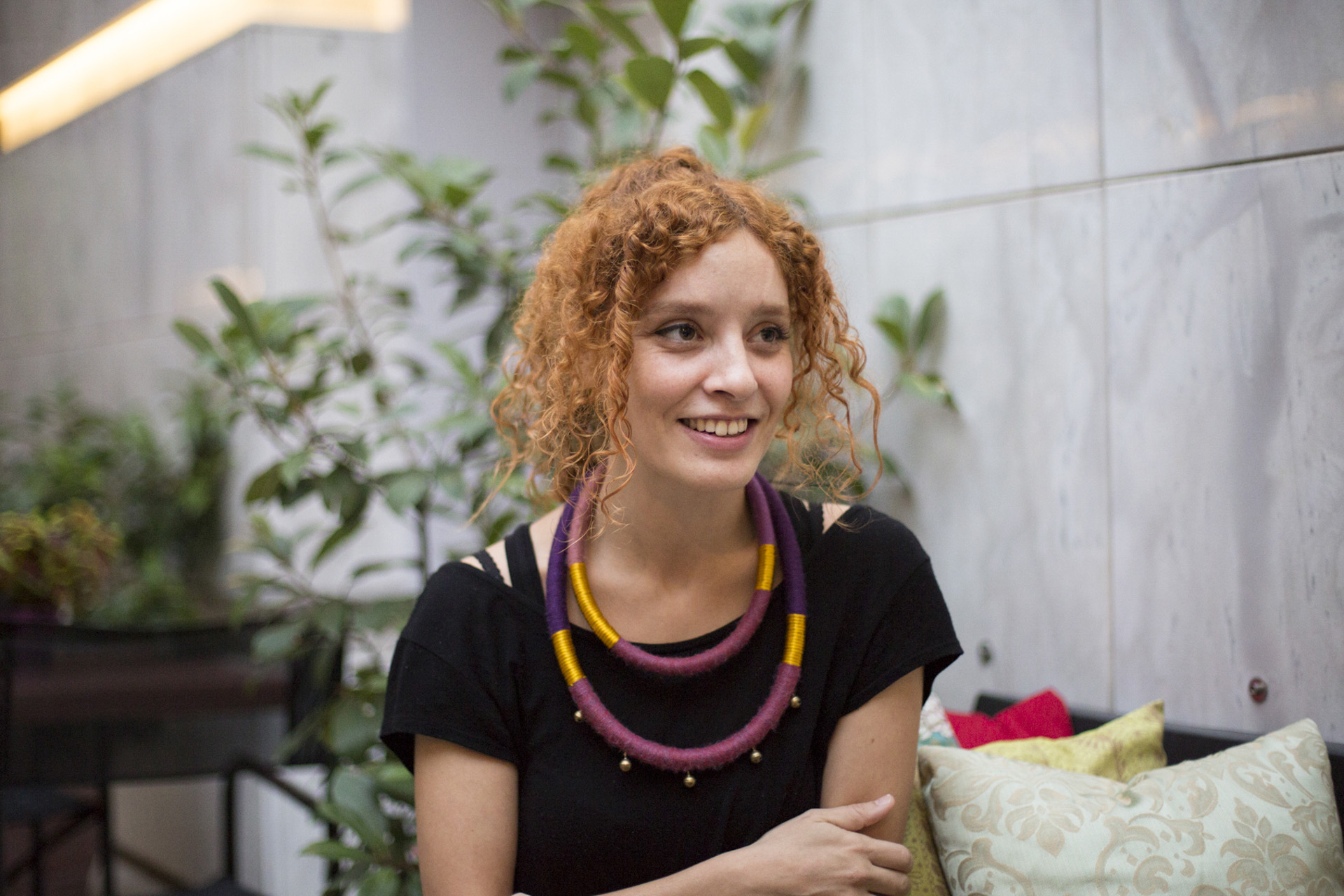 Η συζήτηση ρέει αβίαστα την ώρα που τα βλέμματα των περαστικών σταματούν πρώτα στην ίδια και μετά στις εντυπωσιακές δημιουργίες της. «Ξεκίνησα αυτοδίδακτη να δουλεύω αυτό το μοτίβο, όταν ήμουν στην Αγγλία. Έψαχνα να βρω να φορέσω κάτι τέτοιο σε στυλ tribal. Δεν το έβρισκα κι έτσι αναγκαστικά το έφτιαξα μόνη μου». Τα λεπτά της δάχτυλα αγγίζουν το διπλό μίνιμαλ κολιέ που κυκλώνει σχεδόν με τρυφερότητα το λαιμό της. Νήμα από μετάξι σε εκτυφλωτικό χρυσό, σφιχτοπλεγμένο, στροβιλίζεται γύρω από τον εαυτό του κι αγκαλιάζει μάλλινες μωβ κλωστές. Το αγαπημένο της χρώμα. «Αυτό που φορώ είναι από την τελευταία μου συλλογή, για το φετινό χειμώνα στη οποία έχω χρησιμοποιήσει μετάξι και μαλλί. Το μαλλί είναι καινούρια προσθήκη. Έχει ήδη προηγηθεί μια συλλογή που συνδυάζω το μετάξι με το βαμβάκι. Έχω πειραματιστεί με διάφορα υλικά κατά καιρούς, από τότε που ξεκίνησα φτιάχνοντας κοσμήματα για μένα και για τις φίλες μου. Αλλά αυτός ο χαρακτηριστικός τύπος κοσμήματος προέκυψε από μια δική μου εσωτερική ανάγκη να κάνω κάτι για μένα».