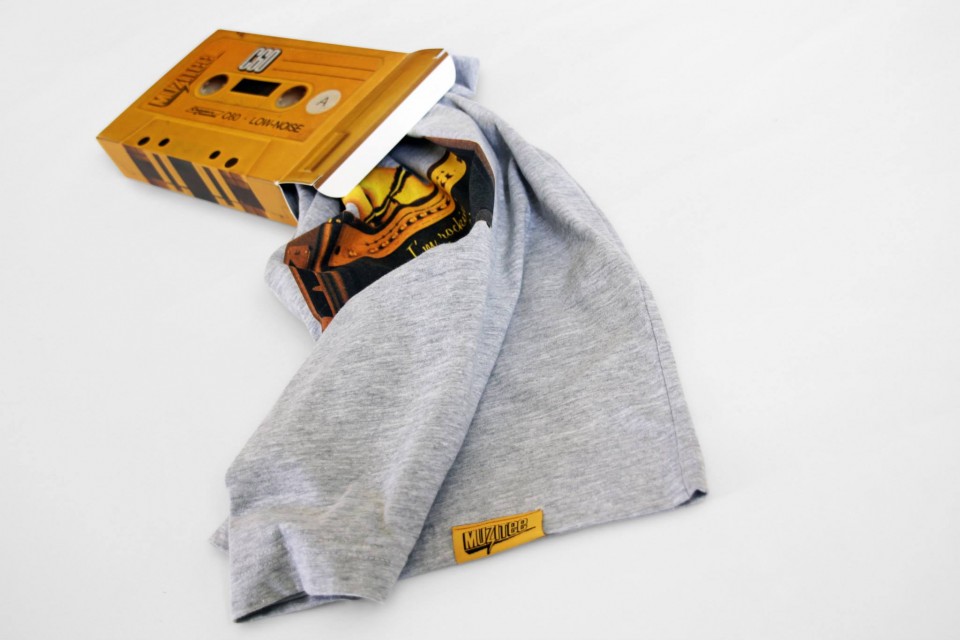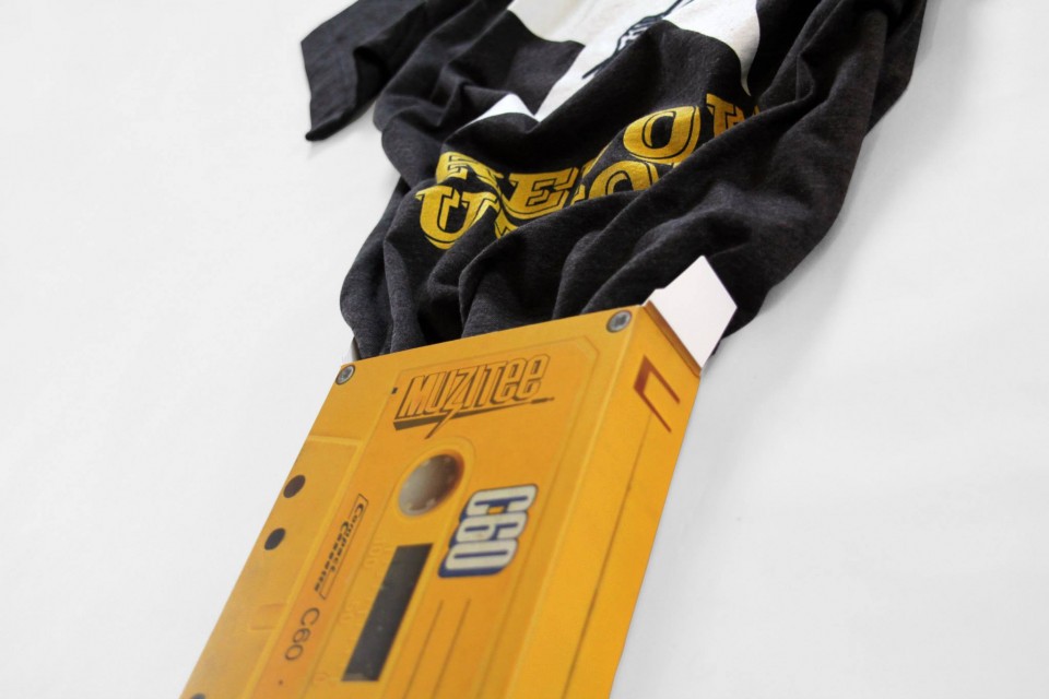 «Σκέφτηκα ότι μία κασέτα θα μπορούσε να λειτουργήσει στη συνέχεια και ως διακοσμητικό στο χώρο ενός ανθρώπου που είναι εραστής της μουσικής. Ήθελα μία κασέτα από τις παλιές – εκείνες του 80, όχι τις διάφανες του 90, και βρήκα μία ωραία κίτρινη από τη συλλογή της μητέρας μου από την εποχή που ήταν φοιτήτρια. Έγραφε απ’ έξω “Νταλάρας – Αλεξίου” από τη μία πλευρά και από την άλλη “διάφορα”. Άραγε είχε διάφορα άλλων καλλιτεχνών ή διάφορα από Νταλάρα και Αλεξίου; Δεν ξέρω. Τη φωτογράφισα απ’ όλες τις πλευρές και μετά πήγα το υλικό σε μία εταιρία που κατασκευάζει κουτιά και μου το έφτιαξαν. Πραγματικά βγήκε καλύτερο απ’ ό,τι περίμενα και δείχνει να έχει γίνει το χαρακτηριστικό “αλατοπίπερο” κάθε Muzitee t-shirt». Προσυπογράφω.