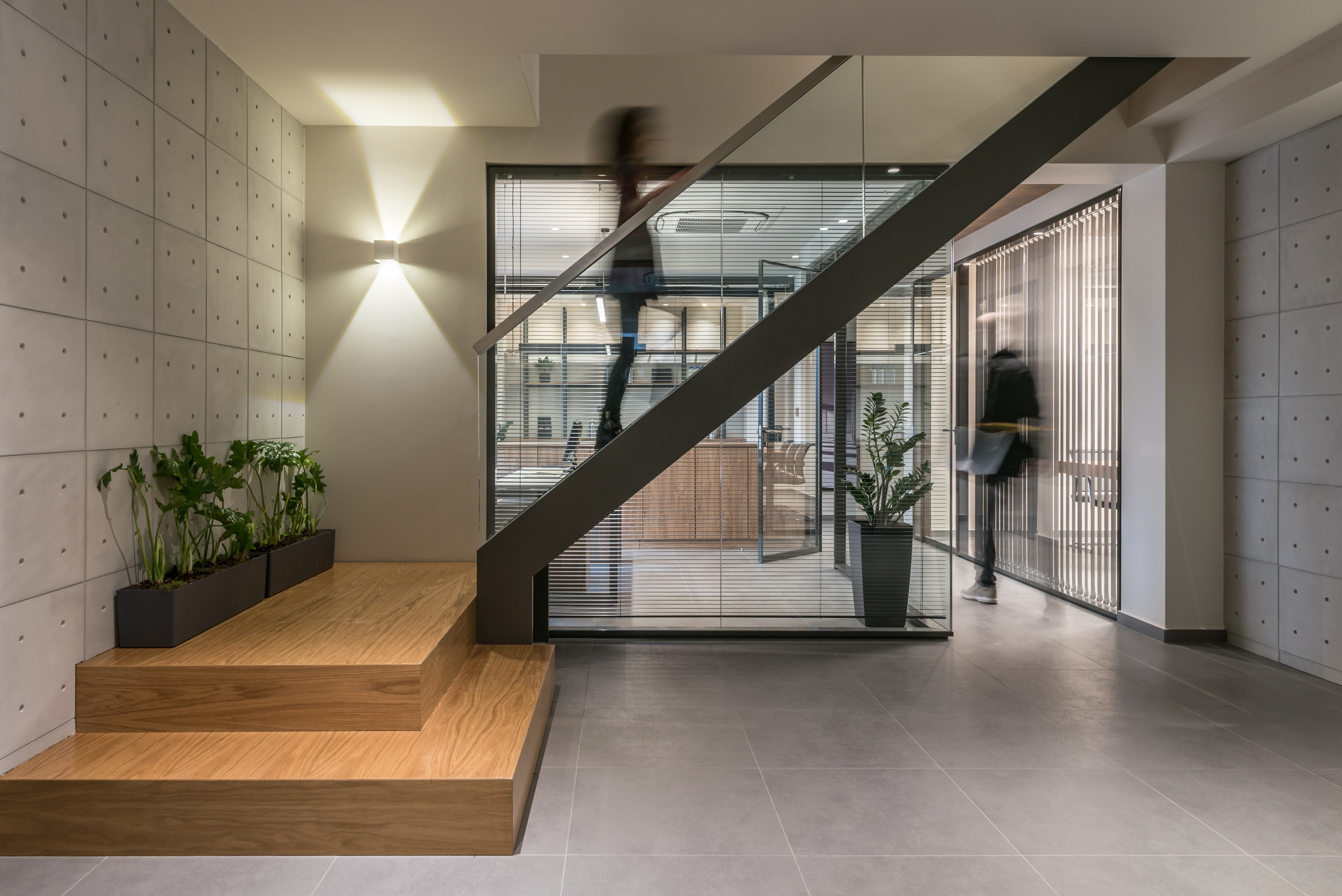 Συγκρότημα Γραφείων “Politakis Group”: Οι χώροι εργασίας διαχωρίζονται με πετάσματα από γυαλί, προσφέροντας καθαρότητα και ενότητα στο χώρο. Επιπροσθέτως, εξασφαλίζεται οπτική επαφή μεταξύ των εργαζομένων και φως στους κοινόχρηστους διαδρόμους κυκλοφορίας με παράλληλη επιλογή συσκότισης με κατακόρυφες περσίδες. Το έργο έλαβε το βραβείο German Design Award 2021 – Special Mention στην κατηγορία Excellent Architecture – Interior Architecture.
