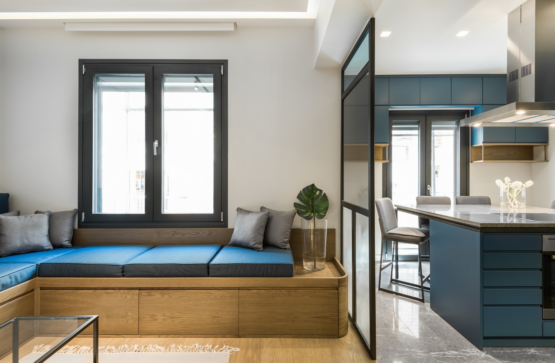 Τα δυο παλιά υπνοδωμάτια έχουν δημιουργήσει έναν ενιαίο χώρο που φιλοξενεί πλέον το σαλόνι και την κουζίνα. Κατά μήκος του μακρύ διαδρόμου, έχουν ενταχθεί χώροι και χρήσεις όπως βιβλιοθήκης/αναγνωστηρίου και ξενώνα. Τα όρια όλων αυτών των χώρων είναι κατασκευασμένα από διαφανές ή ημιδιαφανές γυαλί, προσφέροντας στους χρήστες ιδιωτικότητα ή κοινωνικότητα, ανάλογα με την περίσταση και την επιθυμία τους.