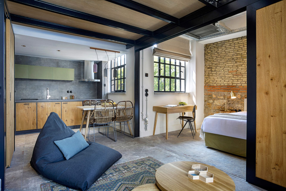 Το Foundry Hotel δεν έχει δωμάτια. Διαθέτει δώδεκα -πλήρως εξοπλισμένα και διαφορετικά μεταξύ τους- διαμερίσματα, φτιαγμένα πάνω στον βιομηχανικό του σκελετό, με γυμνά ταβάνια που ενισχύουν την «ωμη» industrial αίσθηση και μερικές πολύ ενδιαφέρουσες διακοσμητικές και χρηστικές πινελιές. Μην ψάξετε για τηλεόραση, δε θα βρείτε – θα βρείτε όμως πικάπ με μερικά βινύλια για να νιώσετε σαν στο σπίτι σας, ενώ σε δύο διαμερίσματα υπάρχει και πιάνο για όσους ταξιδεύουν μαζί με τις παρτιτούρες τους. Σε δυο διαμερίσματα επίσης υπάρχει ξυλόσομπα για την σπάνια περίπτωση που οι επισκέπτες πετύχουν την Αθήνα σε κατάσταση «Ωκεανίδας», ενώ η ταξιδιωτική εμπειρία των ίδιων των κατασκευαστών του έχει επιβάλλει παρεμβάσεις όπως οι ανοιχτές ντουλάπες και η τοποθέτηση τουαλέτας και ντους σε διαφορετικά σημεία. Σκεφτείτε πόσο χρόνο θα είχατε γλιτώσει στα δικά σας ταξίδια, αν όλα τα δωμάτιά σας ήταν έτσι…