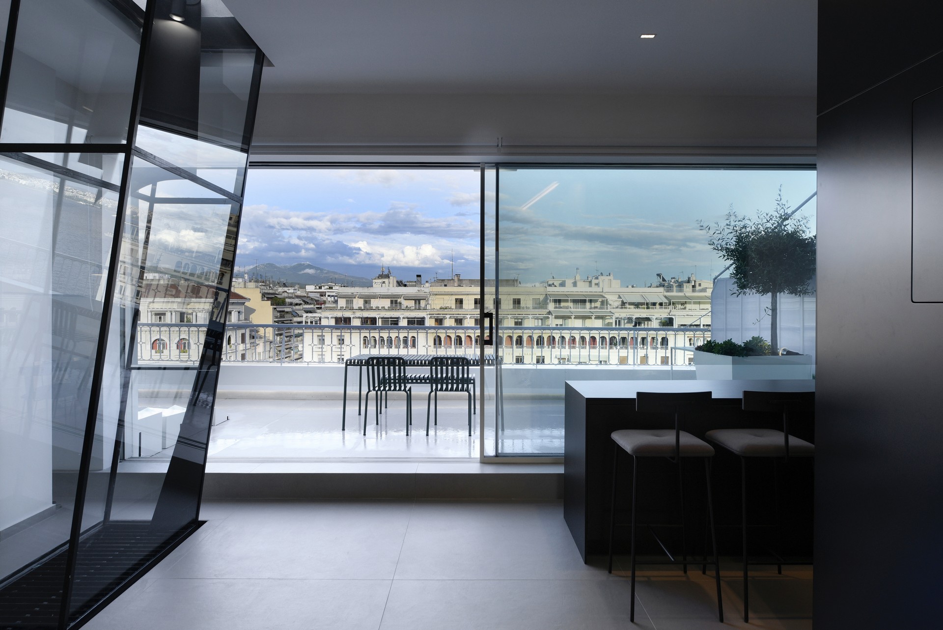 Οι λείες επιφάνειες και οι καθαρές μορφές του εσωτερικού του διαμερίσματος συνδιαλέγονται μέσω της προοπτικής του χώρου και της αίσθησης που παράγεται από τα μεγάλα ανοίγματα με την εκλεκτικιστική αρχιτεκτονική των κτιρίων της Πλατείας Αριστοτέλους που περιβάλλουν το διαμέρισμα.