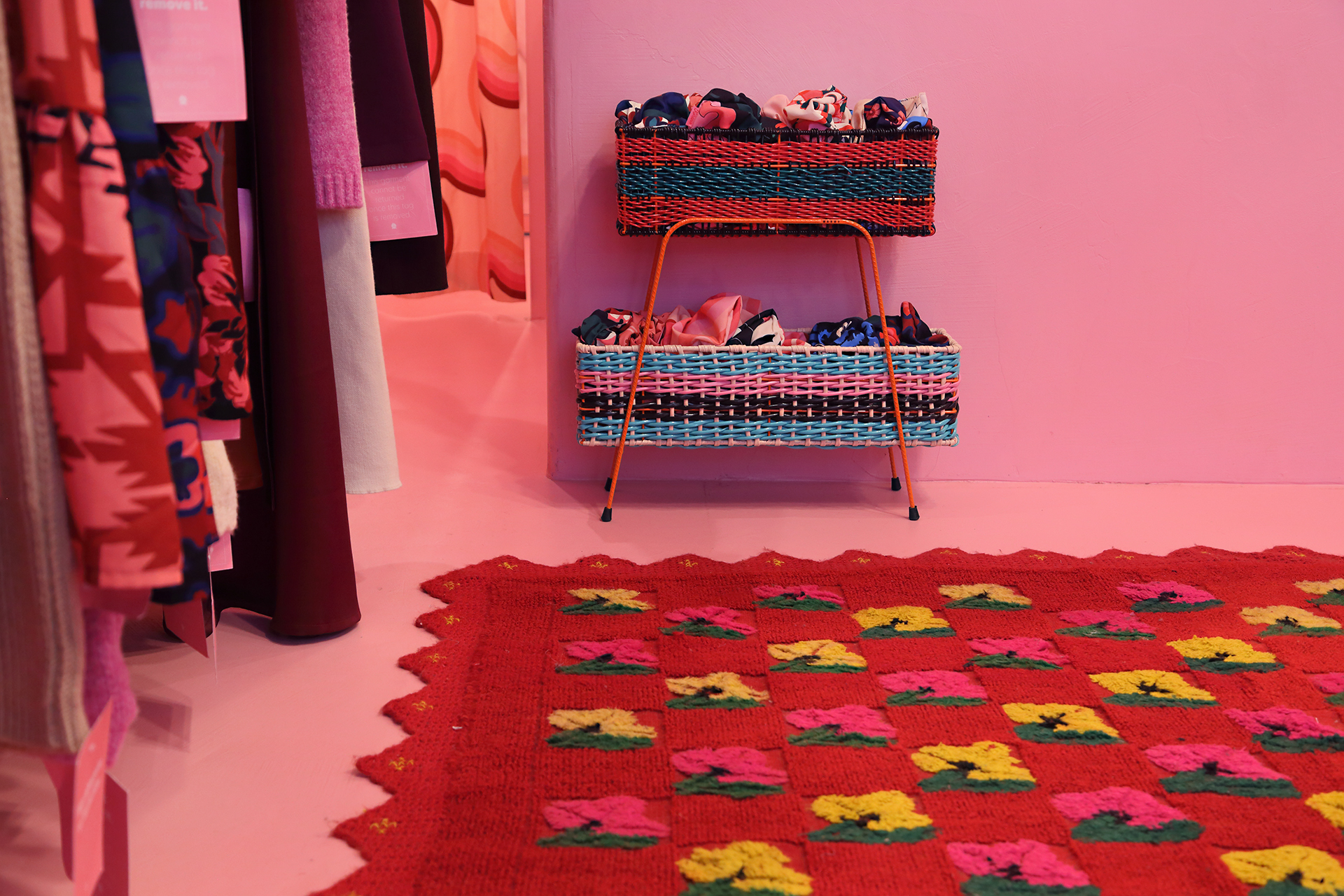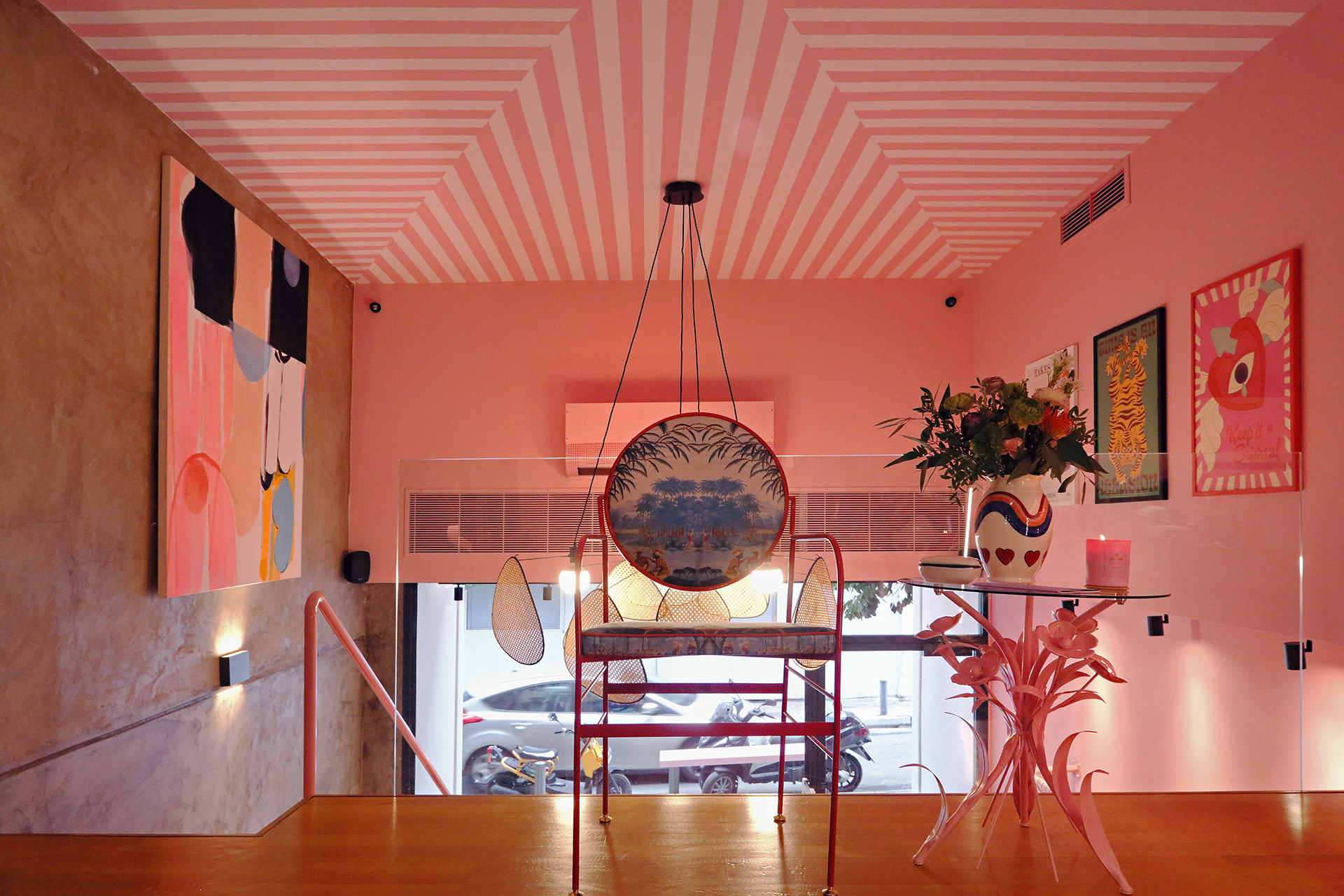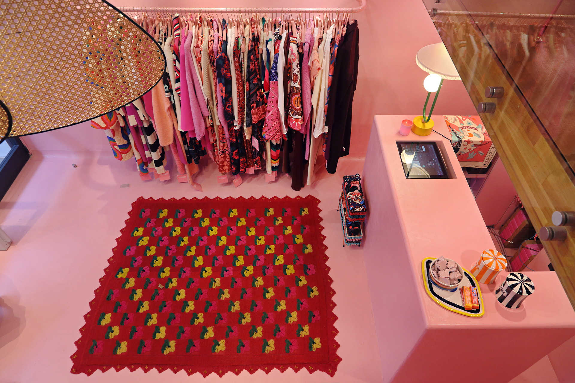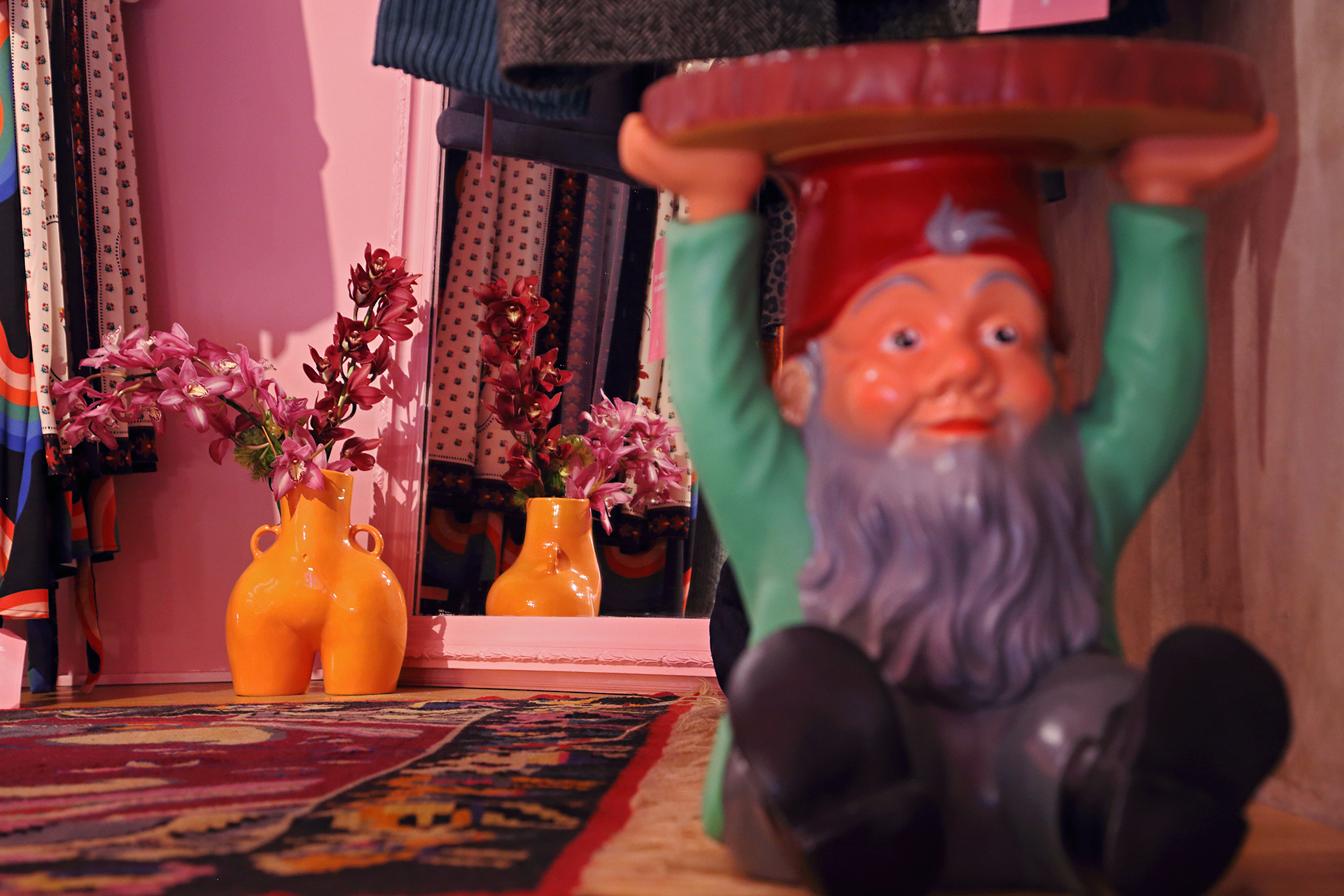 Στο πατάρι μια καρέκλα με εξωτικά μοτίβα, που υπήρχε εδώ και χρόνια στην κατοχή της Μαριλούς Κατσώνη βρήκε την νέα της θέση, ενώ δίπλα της τα πόδια ενός παλιού τραπεζιού βάφτηκαν ροζ και φιλοξενούν ένα λευκό βάζο με φρέσκα λουλούδια και κόκκινες καρδιές. Πάνω στο ταμείο δεσπόζει μια λάμπα La Veste με κίτρινη βάση και πράσινο κορμό, ενώ λίγο πιο ‘κει υπάρχει ένας iconic Gustaf Westman καθρέφτης με ροζ καμπύλες. Και δίπλα του; Ένα ζευγάρι κόκκινες βινύλ μπότες. Διάσπαρτα στον χώρο θα δείτε κεραμικά των Planet Karavan, της σειράς για το σπίτι, που έχει δημιουργήσει το brand. Μέχρι και το πάτωμα είναι προσεγμένο, αφού το στολίζουν χαλιά με πλούσια μοτίβα, με το κόκκινο να κυριαρχεί, προσθέτωντας ζεστασιά, ενώ το πορτοκαλί βάζο που θυμίζει γυναικείο σώμα είναι μια ευχάριστη έκπληξη, καθώς το μάτι περιπλανιέται στον χώρο.