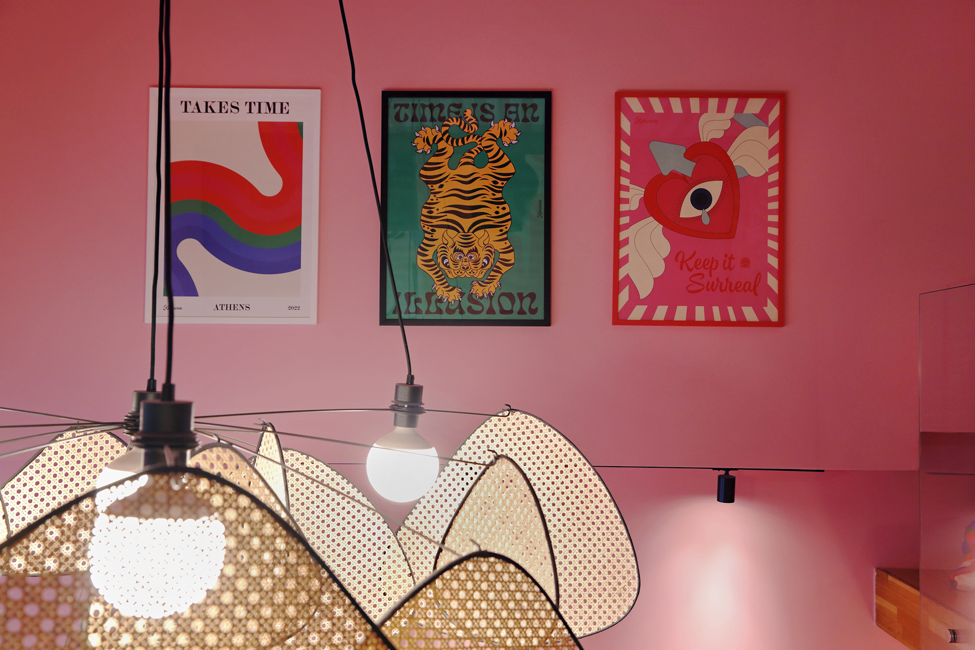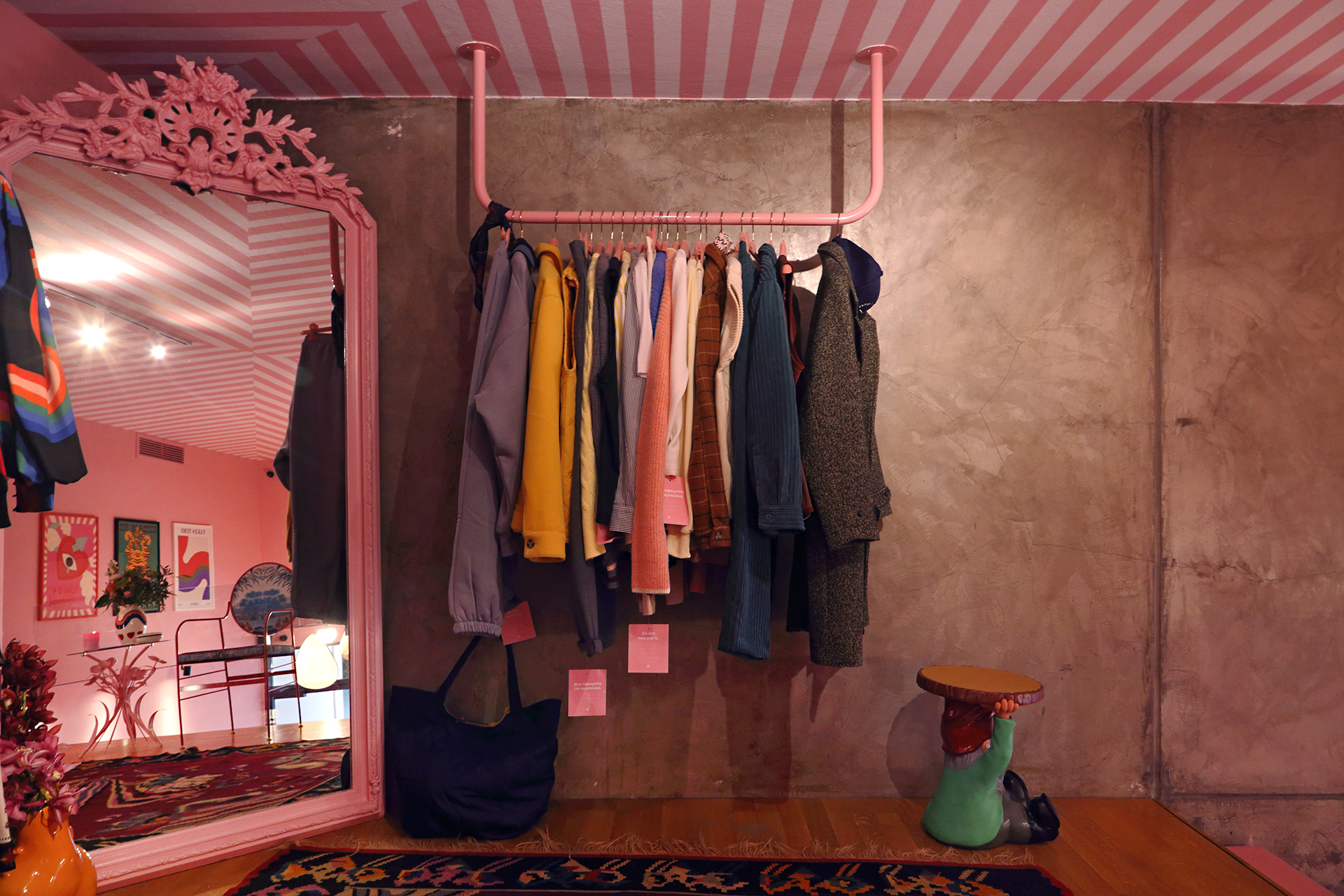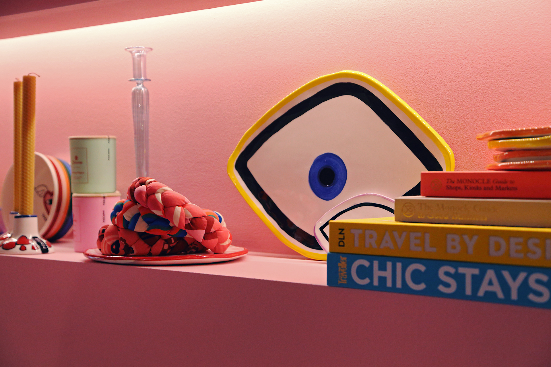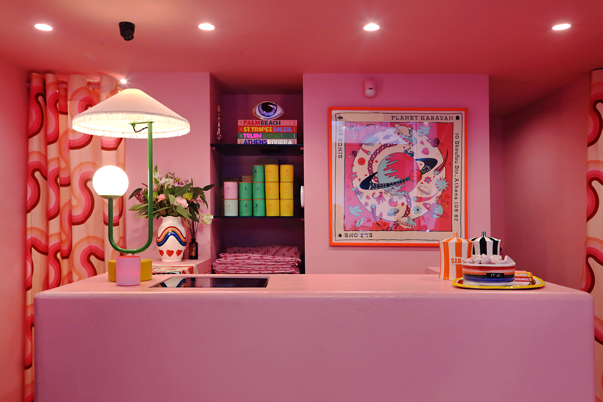«Νοικιάζαμε τον χώρο ακόμα κι όταν φύγαμε από αυτόν. Δεν ξέραμε τι θα τον κάναμε, αλλά εγώ τον αγαπούσα πάρα πολύ και λίγο πριν έρθει ο κορωνοϊός αρχίσαμε να σκεφτόμαστε πως θα μπορούσαμε να τον αξιοποιήσουμε. Τελικά αποφασίσαμε πως αυτό θα είναι και το πρώτο μας φυσικό καταστήματα», λέει χαρακτηριστικά η Μαριλού Κατσώνη. Όταν το καλοκαίρι που μας πέρασε, άρχισαν τελικά οι εργασίες, κανείς από την ομάδα των Karavan δεν είχε ακριβώς στο μυαλό του πώς θα κατέληγε να μοιάζει το κατάστημα. «Δεν ήξερα ότι θα γίνει ροζ. Δεν είχα τίποτα στο μυαλό μου. Πήγαινε όλο το πρότζεκτ μέρα με τη μέρα. Ψώνιζα αντικείμενα συνεχώς, γιατί ήξερα ότι μου αρέσουν πολύ και θα βρω έναν τρόπο να τα ταιριάξω».