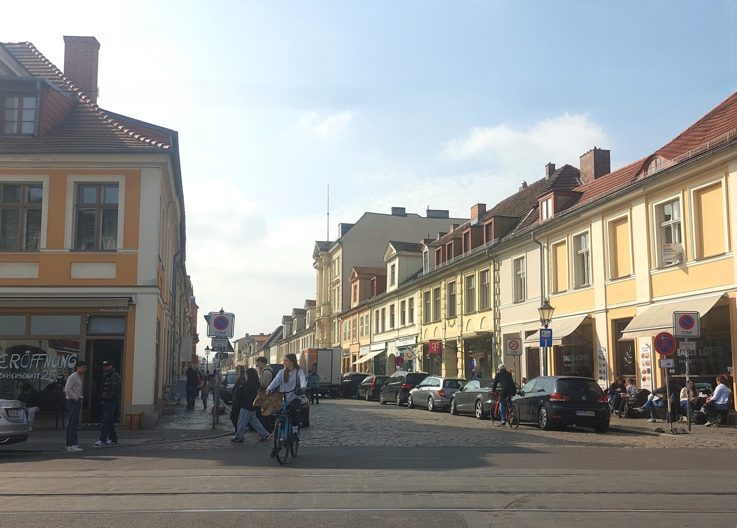 Στο βάθος του κεντρικού δρόμου Friedrich-Ebert strasse, η Πύλη Nauener. Από κάτω της περνάνε οι γραμμές του τραμ.