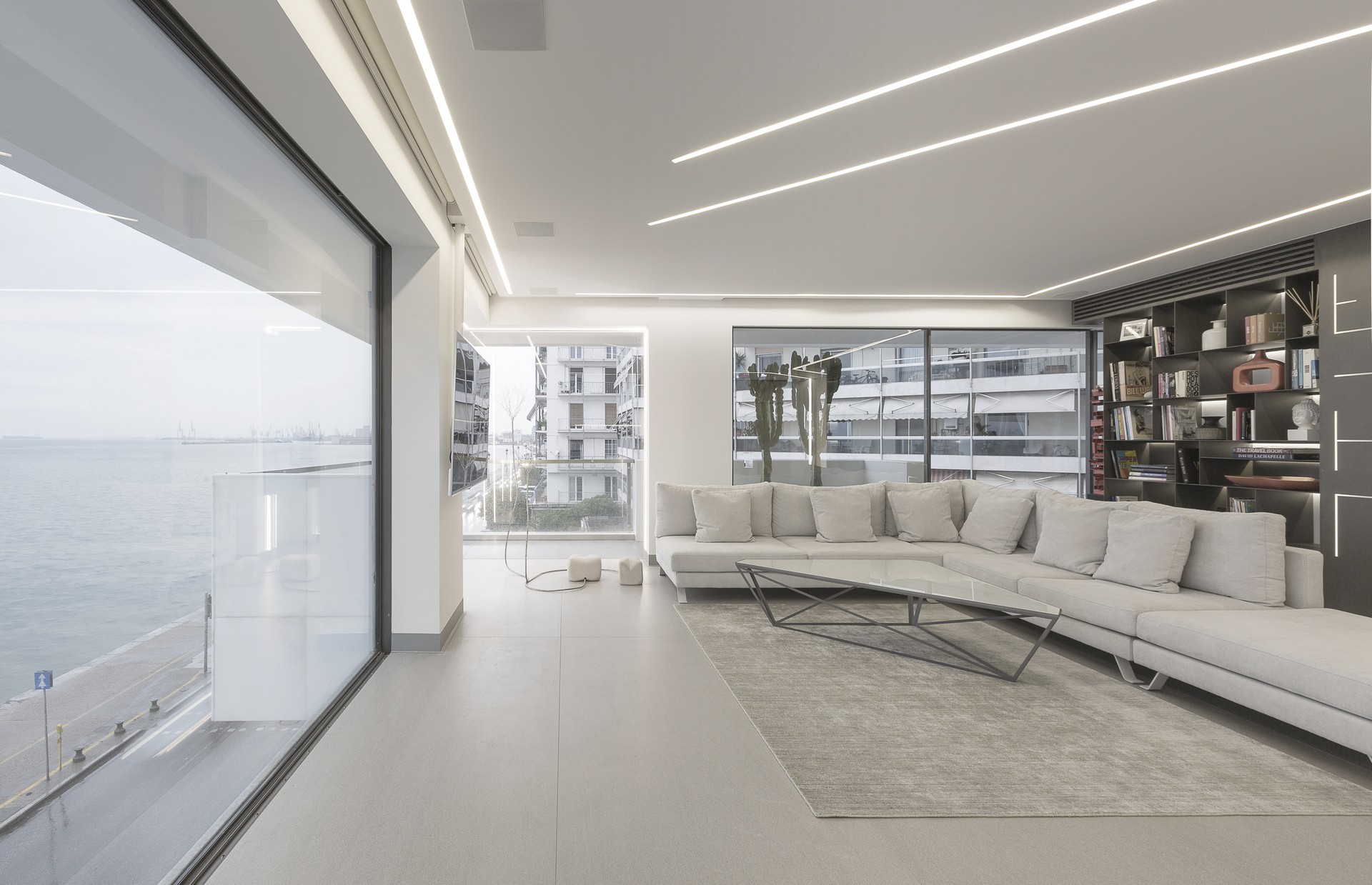 Με θέα τη θάλασσα του Θερμαϊκού και την προβλήτα του λιμανιού της Θεσσαλονίκης, τοποθετημένο πάνω στον πολυσύχναστο δρόμο της Λεωφόρου Νίκης, ένα γωνιακό διαμέρισμα εντυπωσιάζει με την μινιμαλιστική του αισθητική, τις αυστηρές γεωμετρικές γραμμές που το διαμορφώνουν, με σχεδιαστικές και κατασκευαστικές λεπτομέρειες που ακόμα κι αν δεν ορατές με την πρώτη ματιά, συμβάλουν στην ποιοτική κατοίκηση.