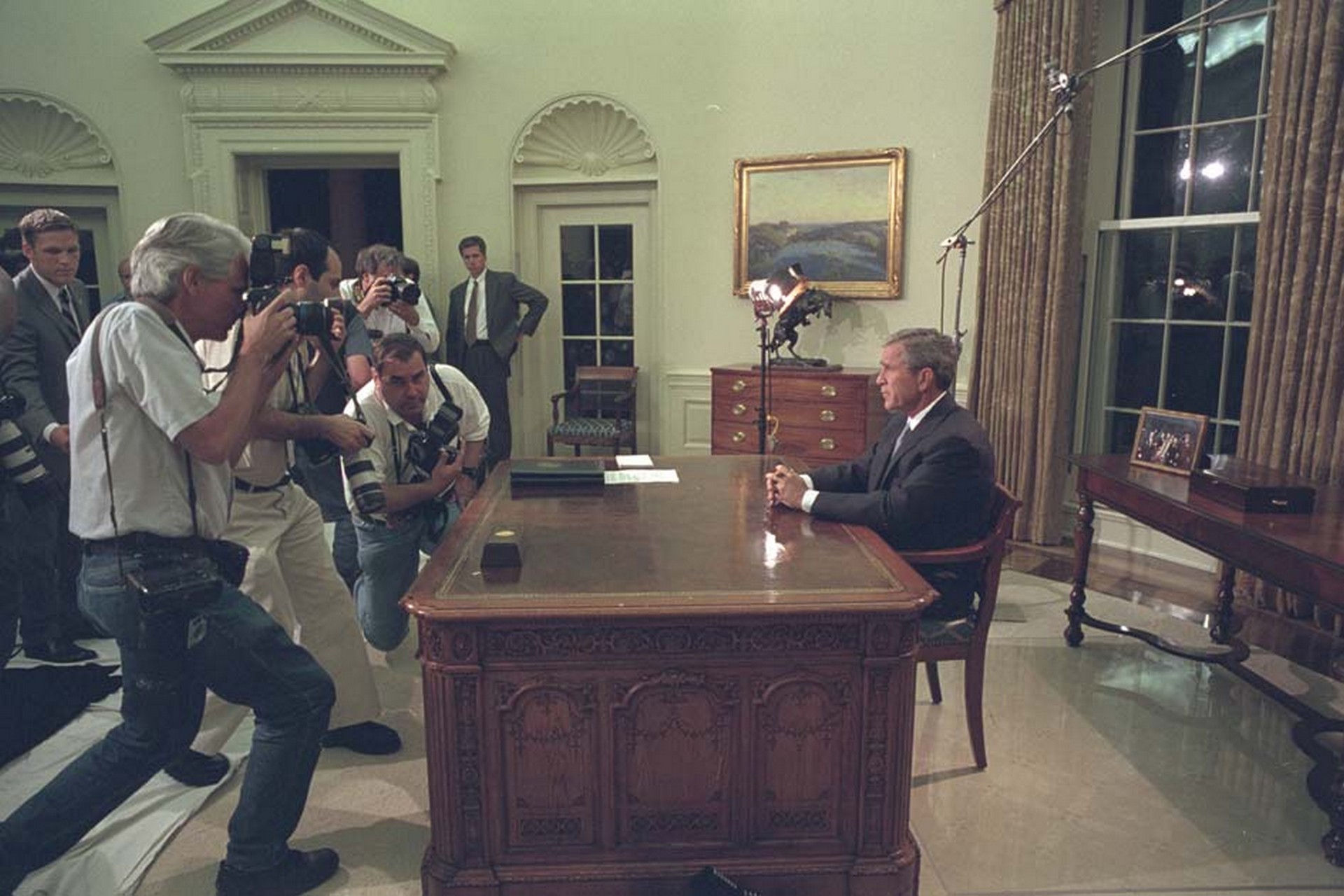 Ο πρόεδρος και το προσωπικό του, αριστέρα διακρίνεται ο Press Secretary Ari Fleischer αποσύρθηκαν σε άλλους χώρους του σχολείου. Εδώ διακρίνεται ο Bush ενώ ετοιμάζει το διάγγελμά του.