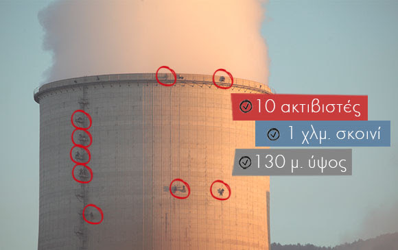Οι ακτιβιστές ανέβηκαν χθες τα ξημερώματα στον πύργο ψύξης του λιγνιτικού Ατμοηλεκτρικού Σταθμού Αγίου Δημητρίου Κοζάνης προκειμένου να στείλουν προς την Κυβέρνηση και τη ΔΕΗ το μήνυμα της καθαρής ενέργειας από ανανεώσιμες πηγές ενέργειας.Όπως οι ίδιοι δήλωσαν, επέλεξαν τον μεγαλύτερο και πιο ρυπογόνο σταθμό της ΔΕΗ στη χώρα προκειμένου να τονίσουν πως το περιβαλλοντικό, κοινωνικό και οικονομικό κόστος για την Ελλάδα θα είναι δραματικά επώδυνο αν και εφόσον υλοποιηθούν τα σχέδια της ΔΕΗ και της κυβέρνησης για την κατασκευή νέων λιγνιτικών και πετρελαϊκών μονάδων στα επόμενα χρόνια.