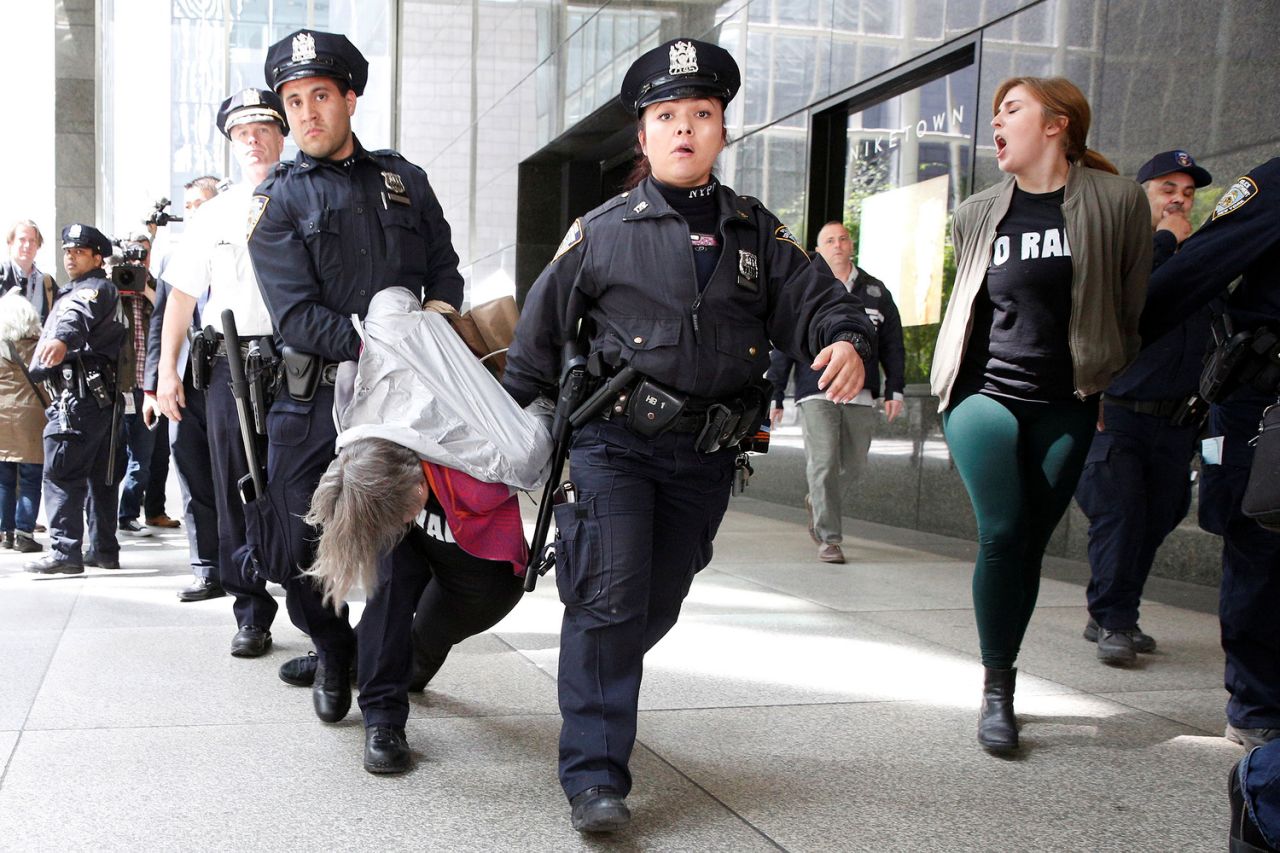 Οι διαδηλωτές είχαν καθίσει μπροστά στους ανελκυστήρες και φώναζαν ρυθμικά το σύνθημα «όχι στην απαγόρευση, όχι στις εφόδους, όχι στο τείχος!». Η αστυνομία απέκλεισε την είσοδο στο πιο γνωστό ακίνητο του Τραμπ, έναν ουρανοξύστη όπου υπάρχουν τόσο καταστήματα όσο και κατοικίες, και όπου διαμένουν η σύζυγός του Μελάνια και ο γιος του Μπάρον όταν ο πρόεδρος βρίσκεται στην Ουάσινγκτον.