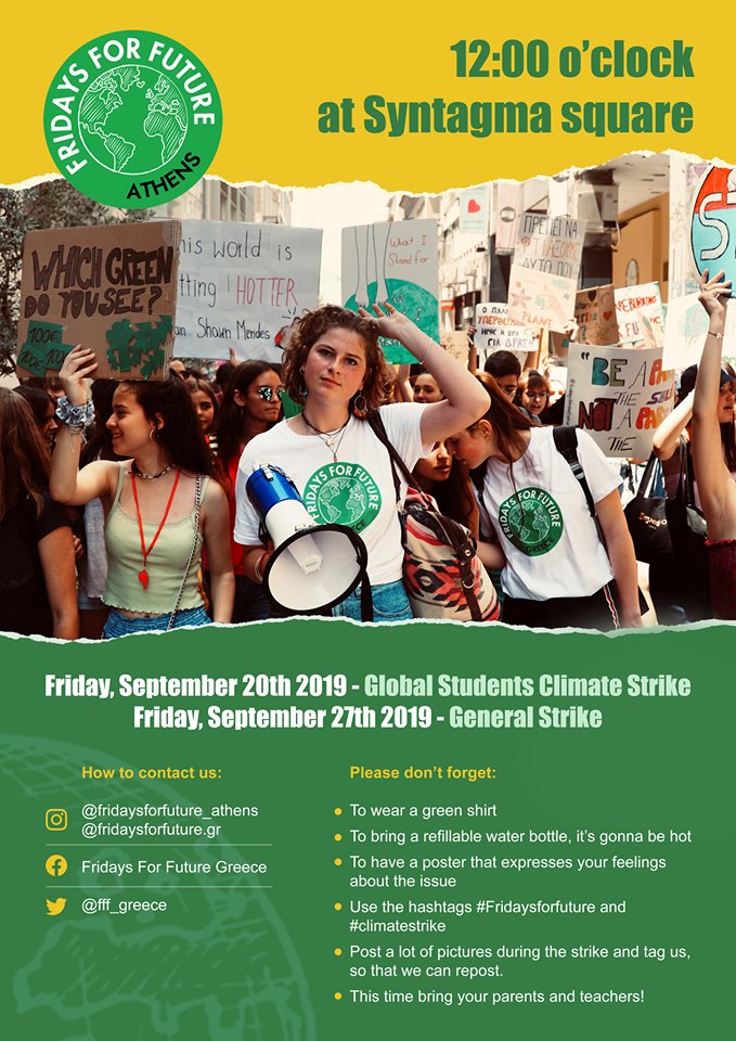 Εμείς, οι 31 οργανώσεις της «Συμμαχίας για το κλίμα», ανταποκρινόμενες στο κάλεσμα των μαθητριών/ών σε γενική απεργία στις 27 Σεπτεμβρίου 2019 και ώρα 12.00μμ στην πλατεία Συντάγματος στην Αθήνα, και σε άλλες περιοχές της χώρας, θα συμμετέχουμε μαζικά για να ενώσουμε τις φωνές μας με το παγκόσμιο κίνημα μαθητριών/ών, πολιτών, σωματείων και λοιπών ομάδων που απαιτούν από τις κυβερνήσεις τους να αναλάβουν άμεση δράση για την αναχαίτιση της κλιματικής κρίσης και την υιοθέτηση πολιτικών που θα διατηρήσουν την πλανητική θερμοκρασία στα πιο βιώσιμα επίπεδα του +1,5°C.