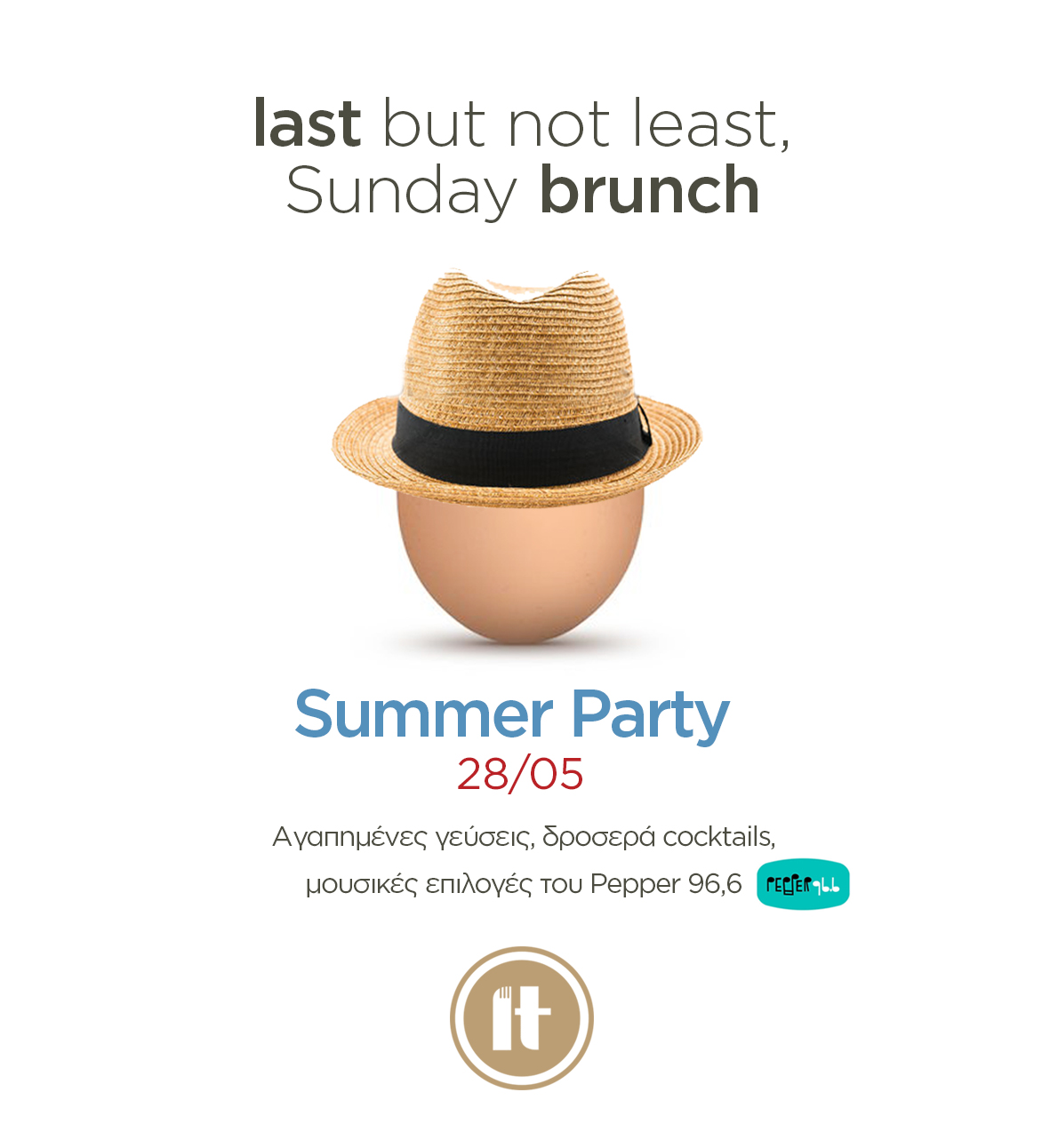 Έτσι λοιπόν, το ΙΤ αποχαιρετά το χειμώνα με το δικό του πάντα urban και χαρούμενο τρόπο! Την Κυριακή 28 Μαΐου, ένα καλοκαιρινό σκηνικό θα στηθεί στη Σκουφά. Η ομάδα του ΙΤ θα βάλει τα καλοκαιρινά της, θα ετοιμάσει δροσερά summer cocktails και ο Pepper 96,6 θα προσθέτει το «πιπέρι» που απαιτεί ένα καλοκαιρινό πάρτυ.