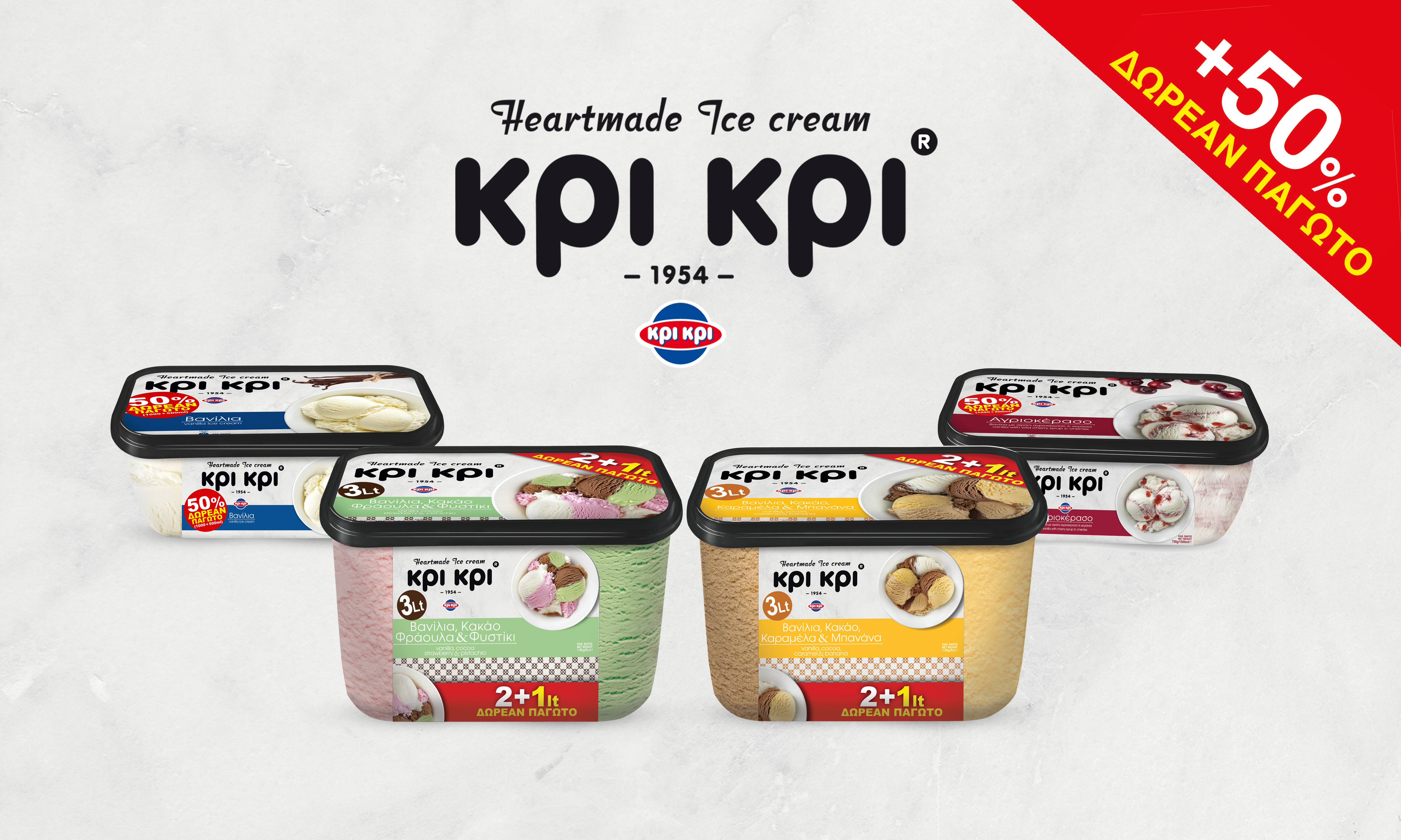 Με περισσότερα από 63 χρόνια εμπειρία στη δημιουργία απολαυστικών παγωτών, η Κρι Κρι μοιράζεται την αγάπη της για αυτή τη μοναδική απόλαυση προσφέροντας επιπλέον 50% παγωτό δώρο στις συσκευασίες των 1.5lt αλλά και των 3lt – η τέλεια αφορμή για να δοκιμάσετε όλες τις γεύσεις μαζί με τους αγαπημένους σας, σε ανέμελες οικογενειακές στιγμές, ή καλοκαιρινά πάρτι με φίλους!