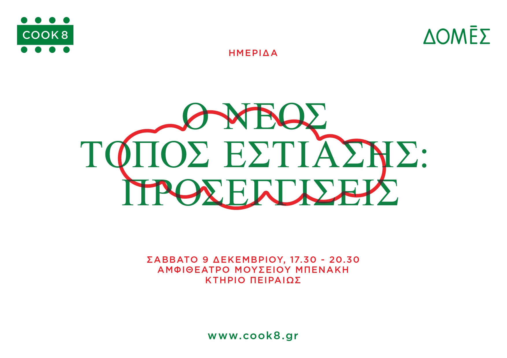 Το Σάββατο 9 Δεκεμβρίου, η Διεθνής Επιθεώρηση Αρχιτεκτονικής ΔΟΜΕΣ, με αφορμή τον Διεθνή Διαγωνισμό Σχεδιασμού COOK8, διοργανώνει την Ημερίδα «Ο νέος τόπος Εστίασης: προσεγγίσεις», στο Αμφιθέατρο του Μουσείου Μπενάκη (Κτήριο οδού Πειραιώς), με ελεύθερη είσοδο.