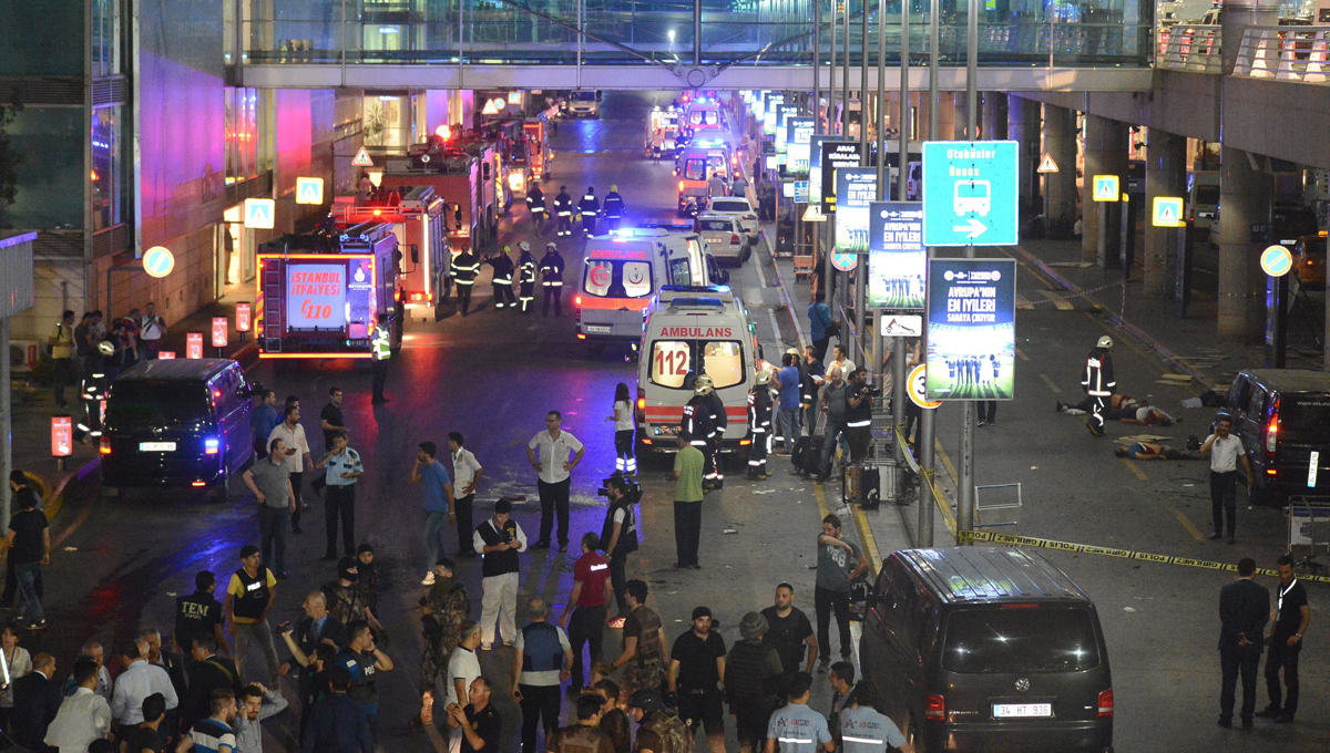 Όπως μετέδωσε δημοσιογράφος του αμερικανικού τηλεοπτικού δικτύου NBC News επικαλούμενος αυτόπτη μάρτυρα ένας αστυνομικός πάλεψε με έναν από τους βομβιστές αυτοκτονίας στο αεροδρόμιο Ατατούρκ της Κωνσταντινούπολης ρίχνοντάς τον στο έδαφος, προτού εκείνος πυροδοτήσει τον εκρηκτικό μηχανισμό του.
